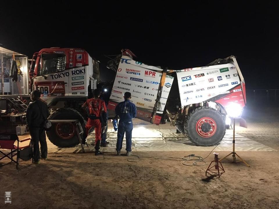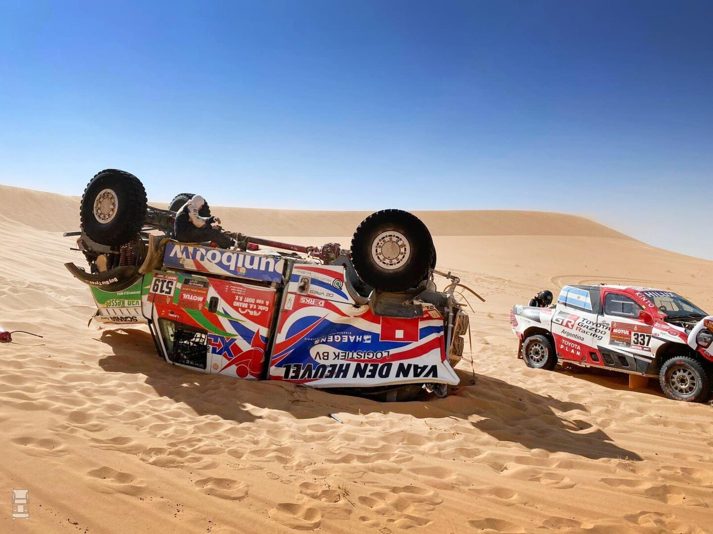 Maurik van den Heuvel stapte ongedeerd uit, maar de truck moet als verloren worden beschouwd. Richard de Groot en Jan Hulsebosch zijn per helikopter afgevoerd met mogelijk een sleutelbeenbreuk en gekneusde ribben. De Iveco moet als verloren worden beschouwd. Ook andere trucks, zoals de Hino van Sugawara, vielen uit zie foto's. Bij andere voertuigklassen vielen eveneens deelnemers uit. Een spijtige ontwikkeling, want zo verliest het startveld aan variatie en kleur. De eer van de Nederlanders moet nu hoog worden gehouden door Martin van den Brink, die met zijn Mammoet Rallysport Renault weer op de achtste plaats staat en Pascal de Baar. Zij kwamen vandaag respectievelijk als elfde en twaalfde binnen. Pascal vertelde dat je niet te hard moet rijden, op safe moet rijden en dan moet proberen om dagelijks een plekje op te schuiven. De Baar liet ook weten, dat zijn teamgenoot Gert Huzink wacht, om de Renault weer aan de gang te krijgen. Buiten mededinging kan Huzink dan de rally vervolgen. De zoon van Martin, Mitchel van den Brink kwam knap als 20e binnen. Hij verleende nog assistentie bij de gecrashte truck van Maurik van den Heuvel.