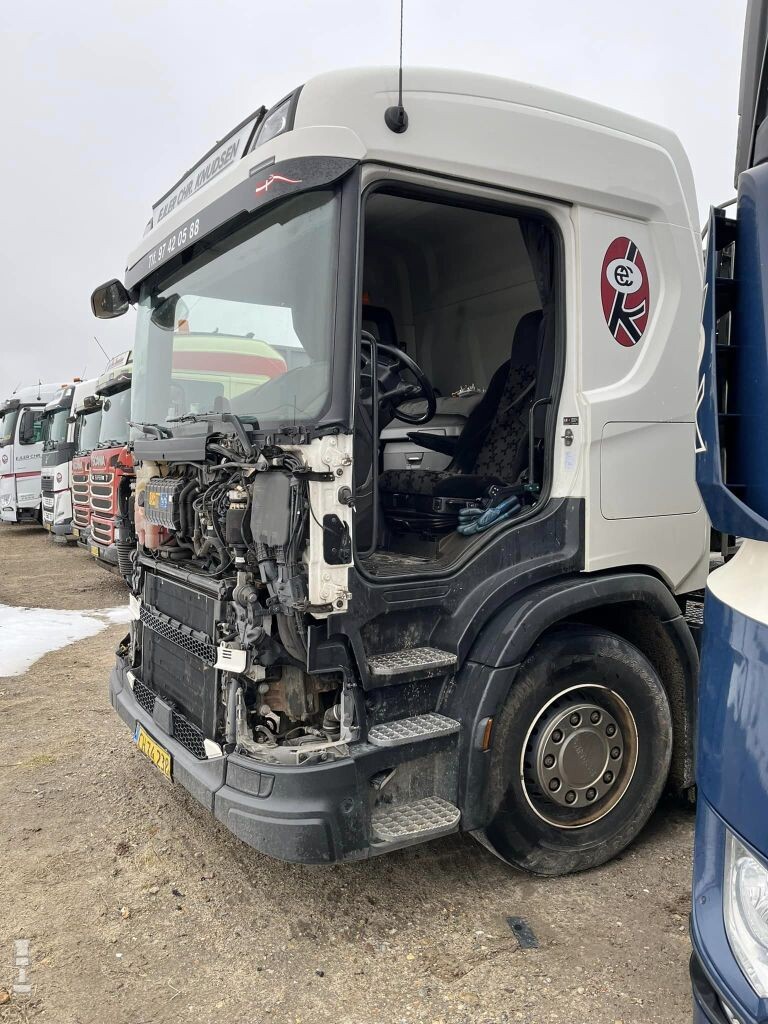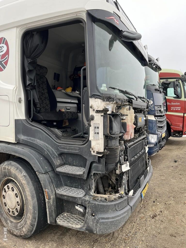 In het hekwerk zit een groot gat, en waarschijnlijk zijn de onderdelen daar ook doorheen verdwenen. De dieven blijken vakkundige monteurs, want alles is netjes losgeschroefd. De grille, koplampen en deuren werden gedemonteerd en meegenomen. Waarschijnlijk voor de lucratieve handel in onderdelen. In Scandinaviƫ is het momenteel een plaag volgens de media. Ook in Noorwegen en Zweden worden regelmatig trucks gestript. Alleen al in de regio Oslo werden vorig najaar zestien van dit soort diefstallen gerapporteerd door de politie. Populair zijn vooral de koplampunits van de Volvo FH, maar ook de Scania onderdelen zijn bijzonder in trek onder dieven. (Bron: 40ton.net)