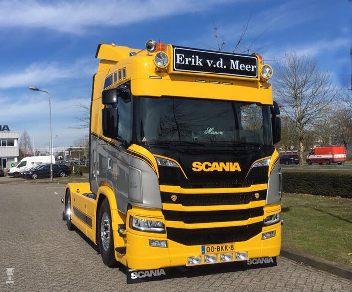 Duidelijk is wel dat door als hoofdkleur voor de grille zwart te kiezen de opvallende diep doorlopende plaat met de merknaam er op minder opvalt. En verder bewijst Erik met zijn nieuwe Scania dat de juiste keuze van kleuren en patronen het verschil maken. Wat ons betreft is dit een hele fraaie trekker geworden, alleen jammer dat hij vooral 's nachts onderweg is. Erik rijdt namelijk in de nachtelijke uren met bloemen en planten tussen de verschillende veilingen in ons land en een aantal Intratuin vestigingen. Hij werkt daarvoor samen met Westerhout Transport uit Werkendam.