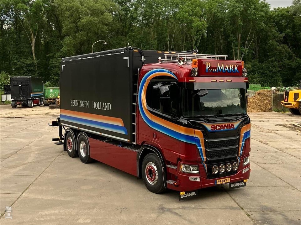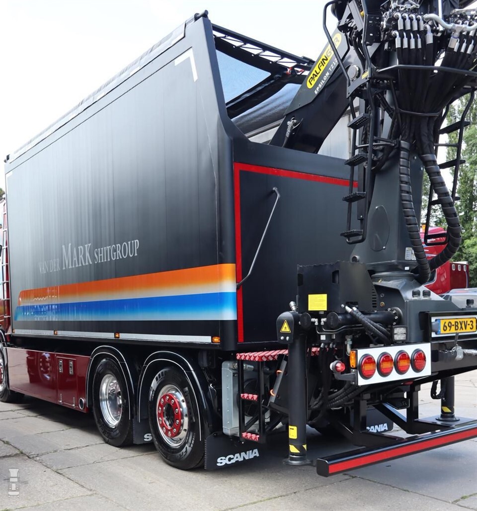 De Scania R530 is alweer de tweede nieuwe Scania voor het bedrijf dit jaar. Bijzonder is dat de vrachtwagen geheel in eigen huis is opgebouwd. Zowel de bak als de Palfinger kraan zijn door de eigen monteurs van Van der Mark gemonteerd. In de eigen werkplaats werd de Scania ook van alle accessoires voorzien, zoals de lichtbak, het dakrek en de nodige verlichting. Overigens zoekt men nog nieuwe monteurs, dus neem bij interesse vooral contact op met Van der Mark.