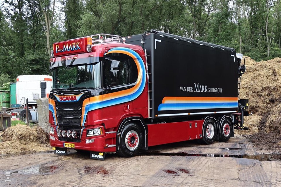 Alleen het bijzondere spuitwerk is elders gedaan: dit werk is uitgevoerd door Van Winkoop in Ermelo. De bijzondere kleuren en strepen dateren overigens al terug tot begin jaren ‘80. In de loop van de jaren reden er al heel wat bijzondere vrachtwagens bij dit bedrijf, dat ondertussen al 45 jaar bestaat. De nieuwe Scania zal worden ingezet voor het transport van groen- en gipsafval, maar vooral van paardenmest. Dit is waar het bedrijf uit Beuningen in specialiseert, wat dan ook resulteerde in de bekende naam ‘Van der Mark Shit Group’.