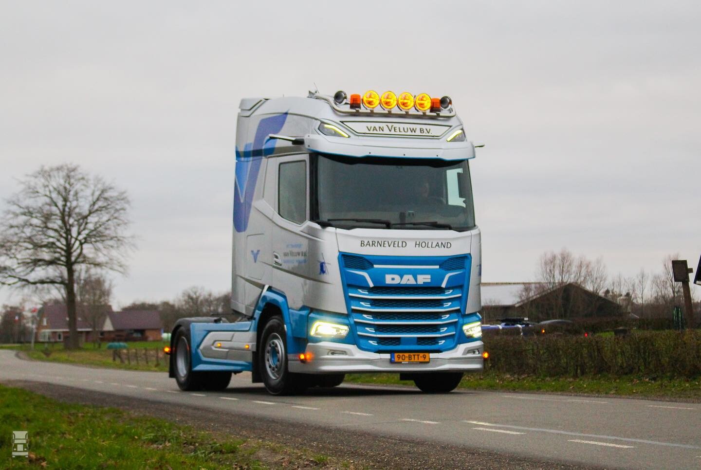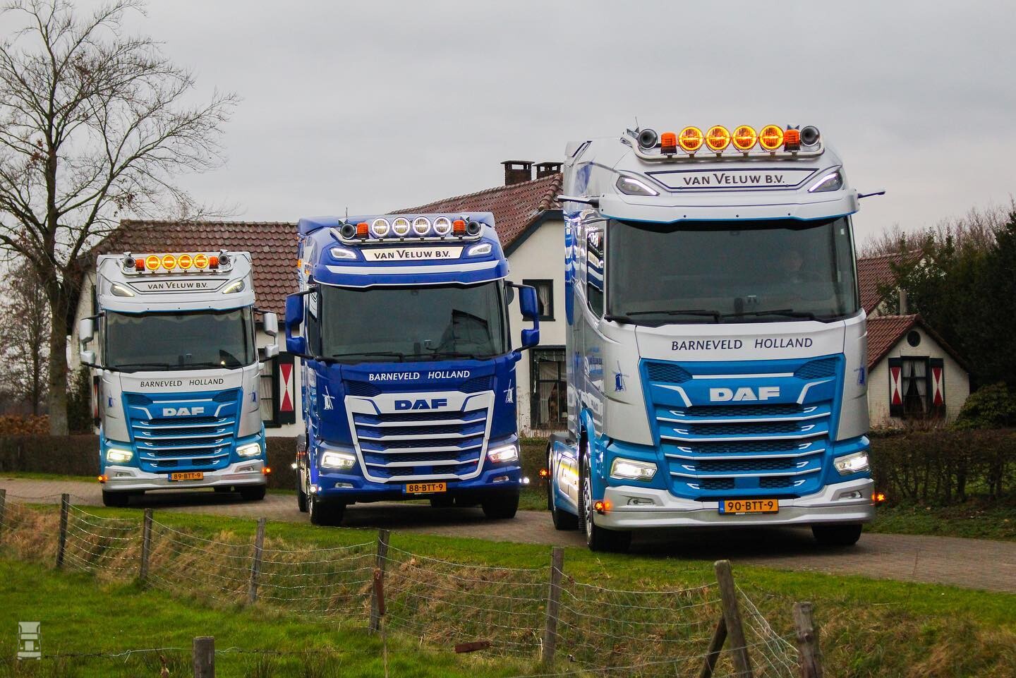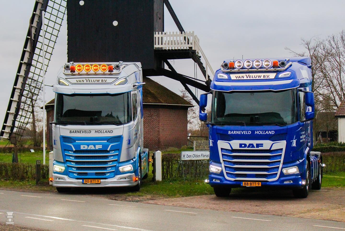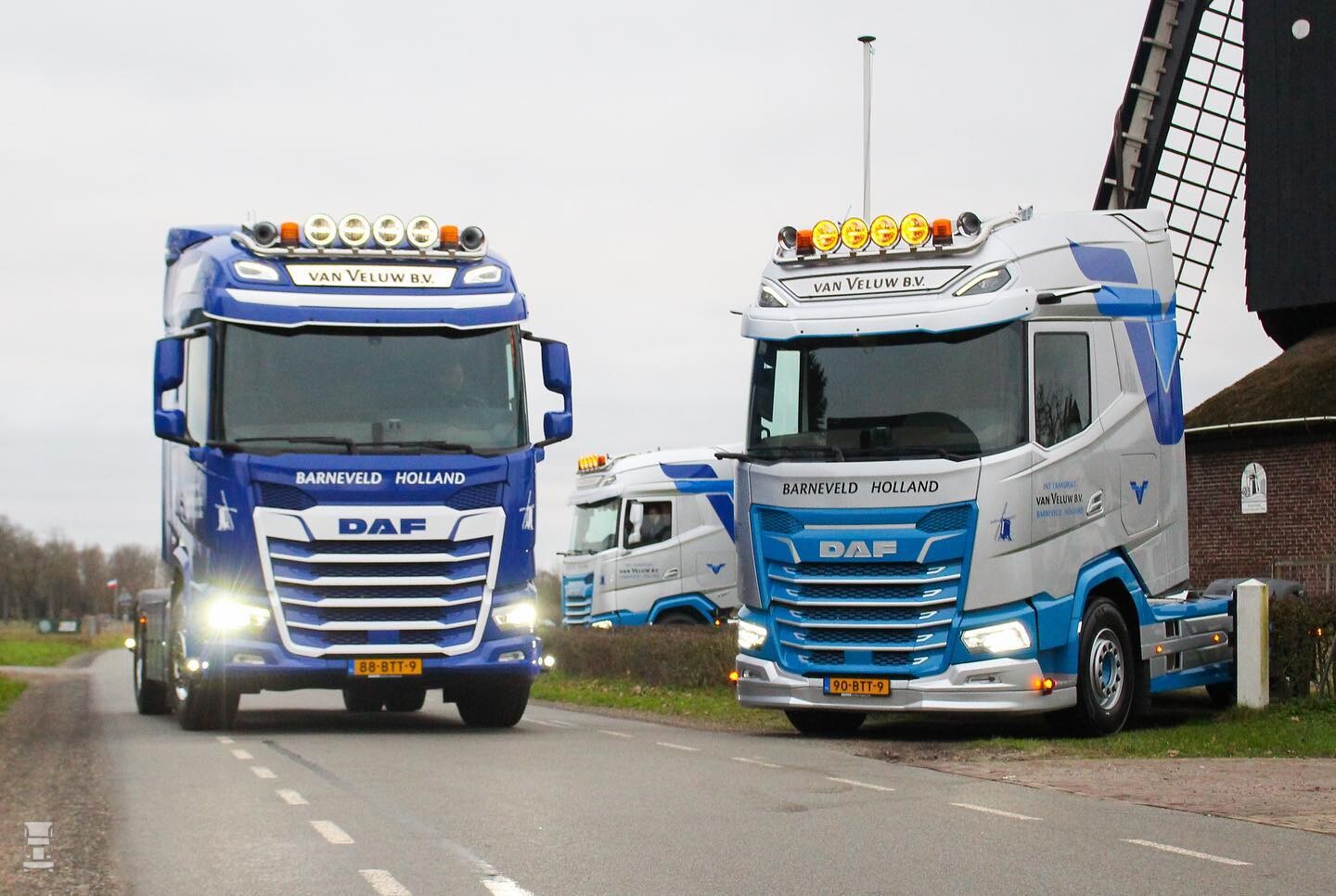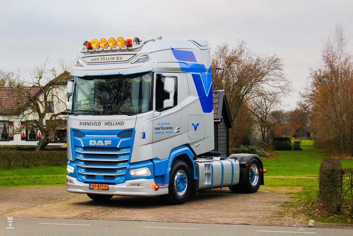 Met de verschillende vermogens wordt het nu interessant om te zien wat de 480 en de 530 doen qua brandstofverbruik bij dezelfde inzet op Italië. De trucks zien er bijzonder fris uit in de kleurstelling van Van Veluw BV, met een stoer lampenrek op het dak en de LED lichtbak tussen de skylights. De drie DAF trekkers werden afgeleverd door Bakker Bedrijfswagens.