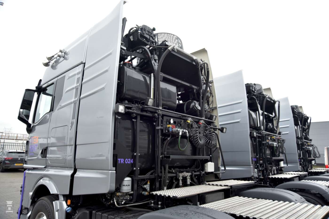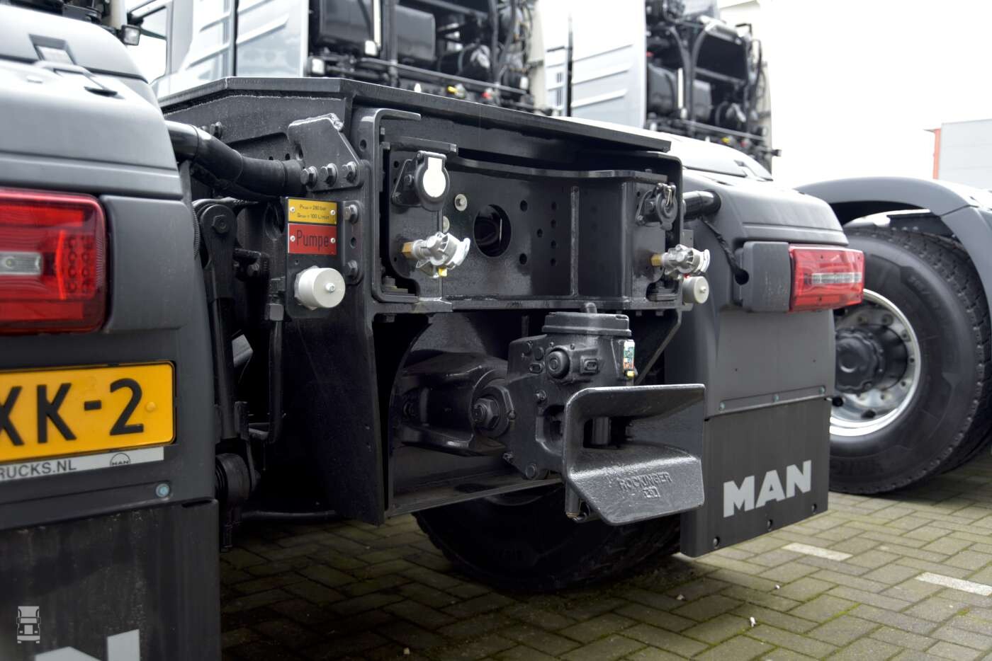 De installatie achter de cabine gaat schuil achter fraaie kunststof panelen, waar een kleine 1.000 liter diesel, de hydraulische installatie voor de oplegger en extra koeling voor de motor met koppelomvormer zijn gemonteerd. De trucks werden verder opgebouwd en afgeleverd door Michel Schroots van Van Leeuwen Truckservice in samenwerking met Coen van Egmond van MAN Truck & Bus BV.