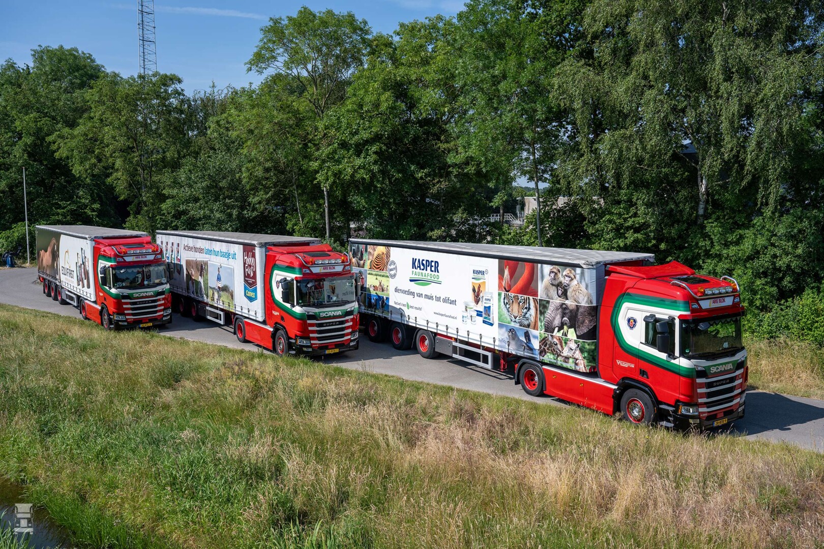 Daartoe komt er achter de nieuwe Scania’s een zeilentrailer met een meeneemheftruck. “Op die manier beleveren onze chauffeurs zowel dierenspeciaalzaken als dierentuinen. De reden dat we op zulke lage banden rijden, is eigenlijk gekomen door de aanscherping van de Arbowet. Vroeger mochten zakken 25 kilogram zwaar zijn, maar nu nog maar 20. Dat betekent dat we voor hetzelfde aantal kilo’s het volume moesten optimaliseren. Daarvoor hebben we drie trailers laten bouwen met een binnenhoogte van 2,85 meter die we Doppelstock beladen. Met de lage bandenmaat blijven we dan net binnen de vier meter hoogte en kunnen we voldoende meenemen voor een rendabele rit. Dus in die zin is het toch wel een beetje speciaal.”