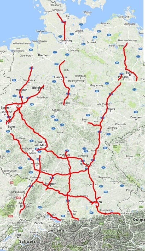 van de aansluiting Schleswig/Jagel tot de aansluiting Hamburg-Schnelsen-Nord, van de aansluiting Soltau-Süd tot aansluiting Göttingen-Nord, van Autobahndreieck Schweinfurt/Werneck via Autobahnkreuz Biebelried, Autobahnkreuz Ulm.Elchingen en Autobahndreieck Allgäu tot aan Autobahnende Bundesgrenz Füssen |