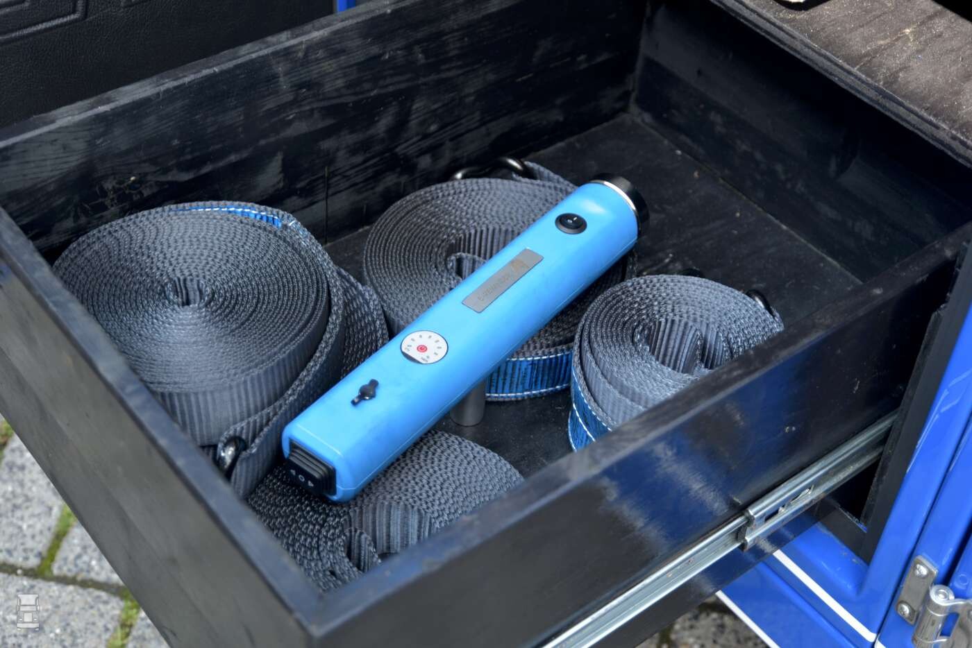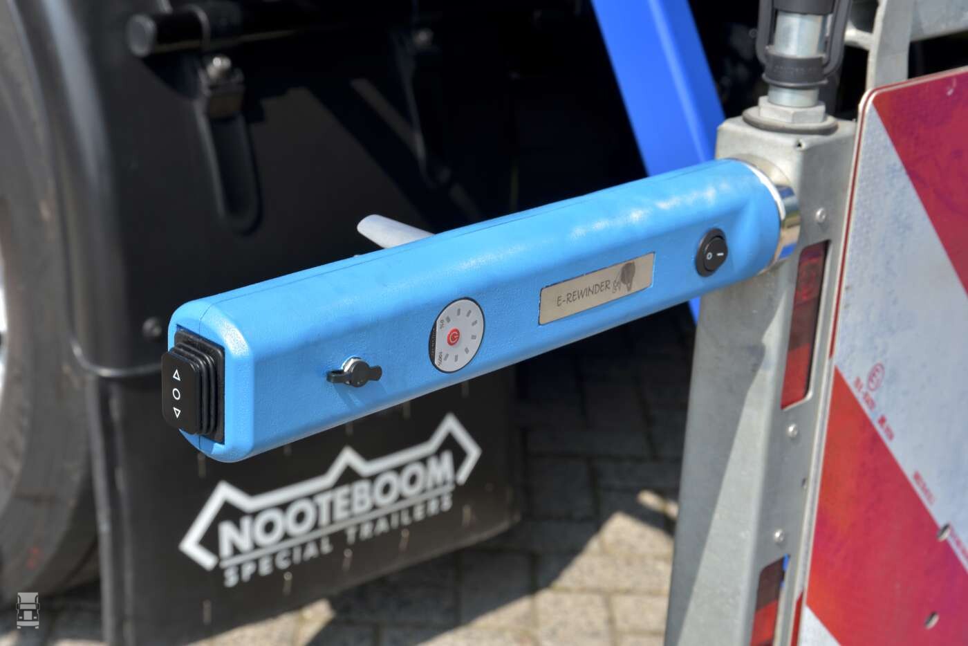 Het apparaatje is voorzien van een stevige accu die je eenvoudig in de cabine oplaad. Of in de kist onder je trailer natuurlijk, als je daar stroom hebt. Op de E-rewinder zitten twee schakelaars: Aan en uit, en vooruit en achteruit. Dat is slim, want daardoor is er ook voor linkshandige chauffeurs mee te werken. Verder is er een metertje wat aangeeft hoe vol de accu nog is.