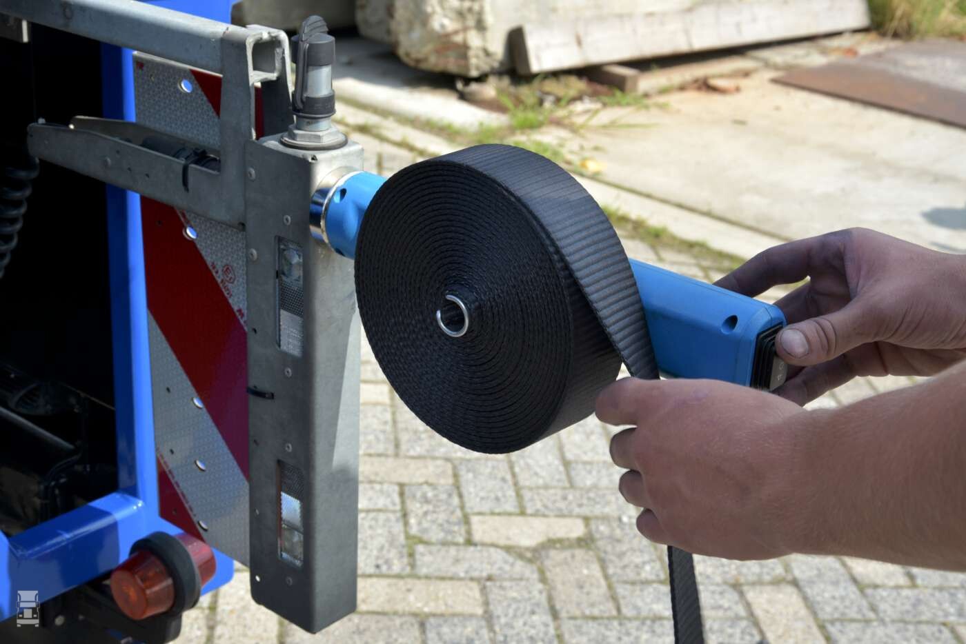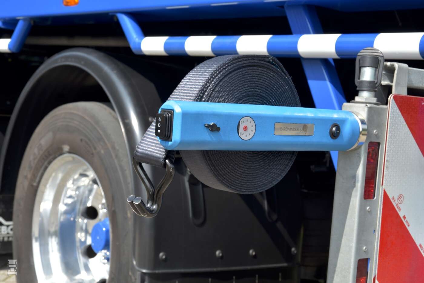 Met een zware magneet is de E-rewinder eenvoudig op iedere gewenste plek vast te zetten op je trailer. Het werken met dit slimme apparaat is verbluffend eenvoudig en je zult versteld staan van de tijdwinst die je er mee haalt. Vooral met ladingen waarbij veel spanbanden nodig zijn, zoals bij staal scheelt het je zomaar een half uur per dag. En dan de hamvraag, wat kost zo’n E-rewinder? Wim geeft aan dat de prijs nu op 120 Euro ligt. Een bedrag wat je zomaar terug verdient als je een half uur per dag tijdwinst boekt!