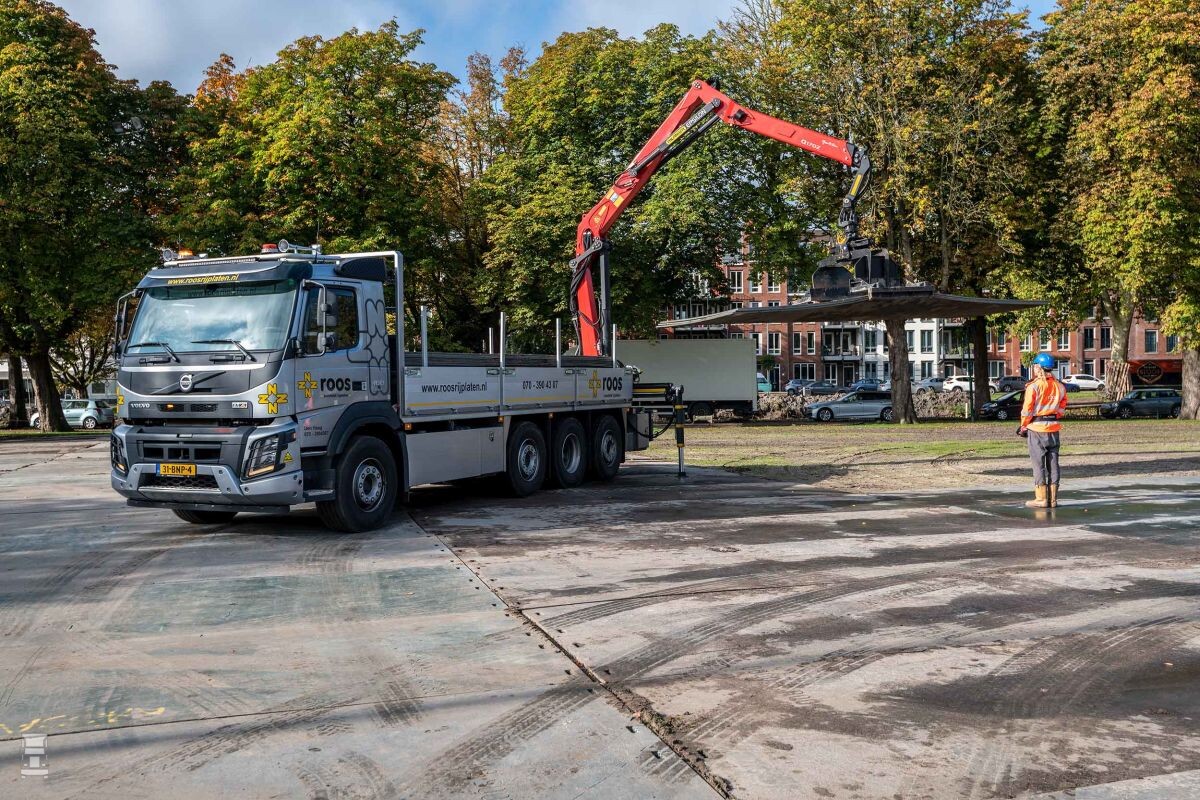 Roos Kunststof Rijplaten Verhuur uit Den Haag heeft een Volvo FMX 460 8x2 tridem met autolaadkraan in gebruik genomen. De truck en de autolaadkraan kunnen met één afstandsbediening worden bediend.