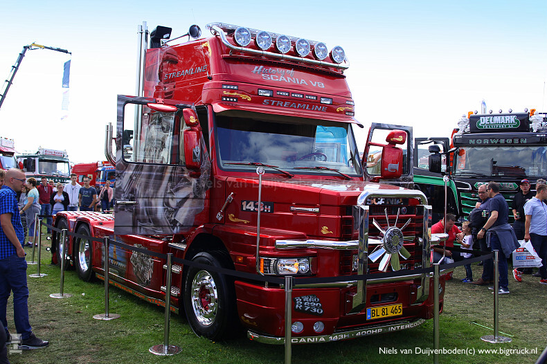 Op Lopik zagen we deze bijzondere Scania Torpedo. Je houd ervan of je vind het afschuwelijk, feit is wel dit is iets bijzonders! De Deen Poul Willy Andresen had al 2 bijzondere torpedo`s; een Scania L111 en een T164. Allebei in het Candyrood gespoten en vol met airbushes die allebeij iets met het verleden over Scania te maken hebben.