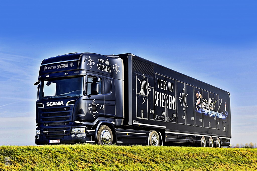 Spiessens Vis uit het Belgische Bornem heeft een nieuwe viskraam laten bouwen door Elenbaas Carrosserie, maar niet zomaar een verkoopwagen. De oplegger is een soort 'transformer' en er voor staat een gloedjenieuwe Scania R520 V8 Topline trekker!