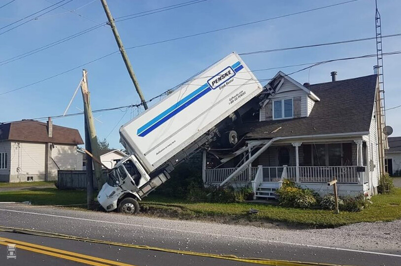 Een bakwagen die een landing maakt op het dak van een huis. Dat kan alleen maar met een orkaan zou je zeggen, maar dat is niet het geval. Deze Canadese chauffeur raakte een paal en bij die aanrijding kwam de lege bakwagen aan de achterkant omhoog, draaide een slagje en landde op het huis!