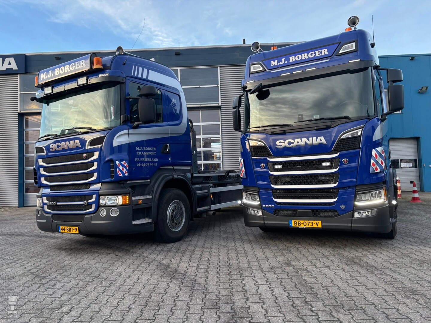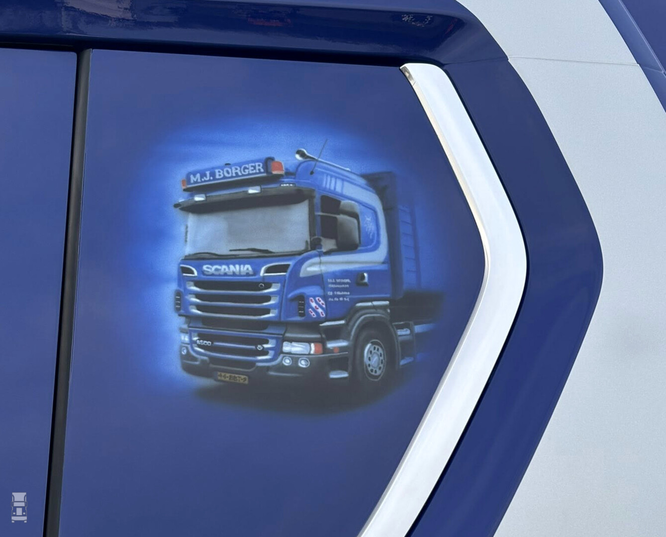 De nieuwe Scania R530 Highline vervangt de trouwe R500 V8, een truck die na 1,6 miljoen kilometers werd ingeruild. Toch wordt de oude V8 niet vergeten, die staat keurig afgebeeld op de zijwanden van de nieuwe truck in een fraaie airbrush!