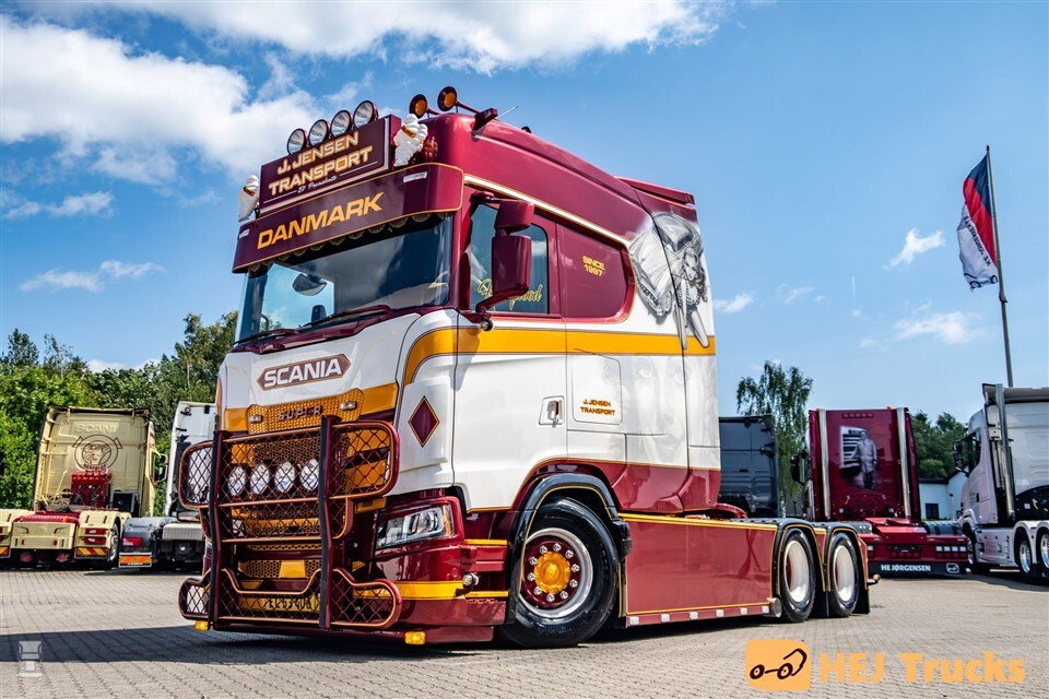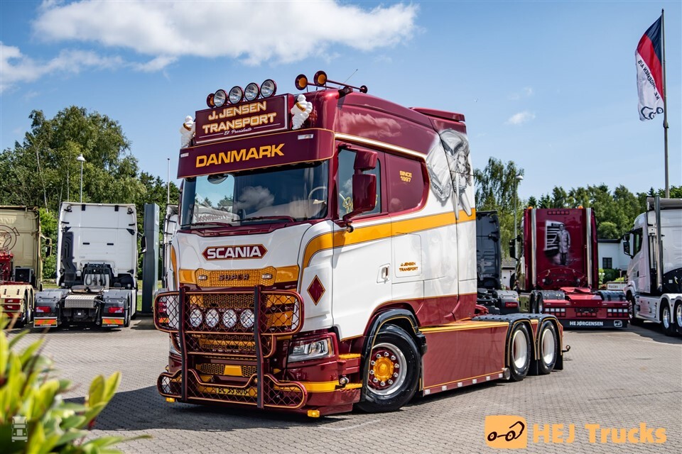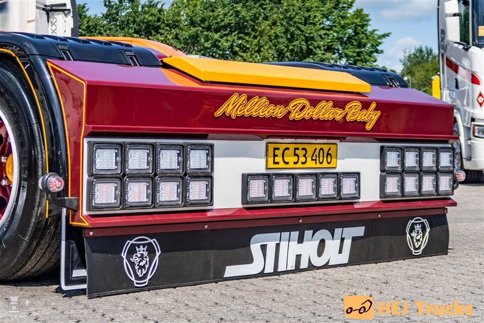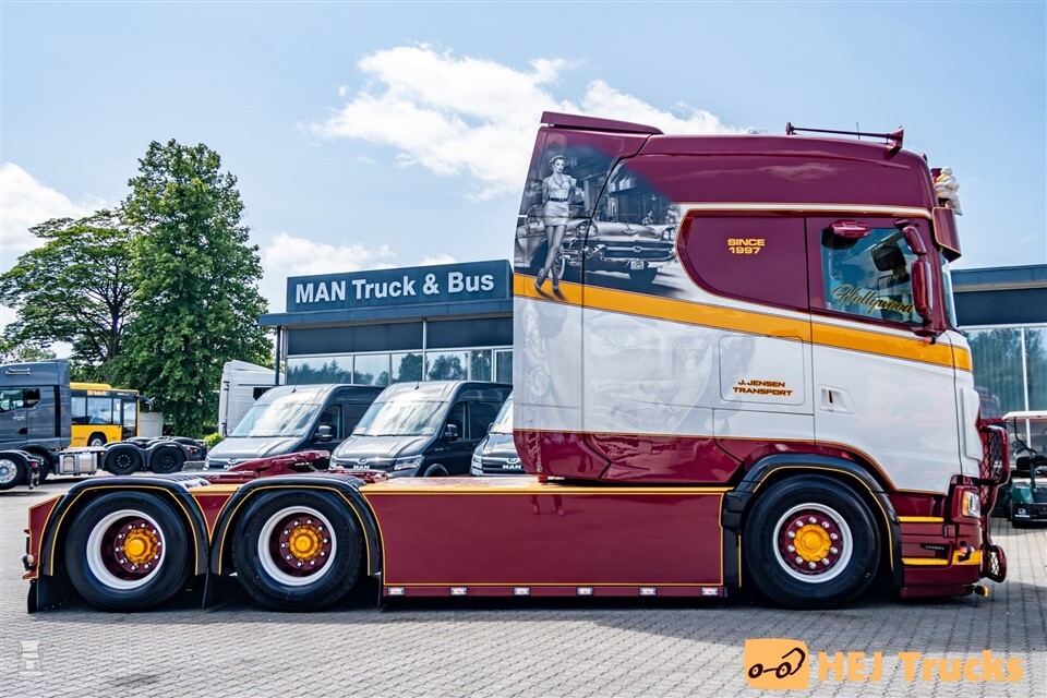 Naar verluid heeft J. Jensen Transport de primeur met de eerste Scania S770 Longline in Denemarken. De afkomst van deze auto kennen we niet: we vermoeden dat de verlenging is uitgevoerd bij Vlastuin. Hoe dan ook is het resultaat schitterend: een echte ‘Million Dollar Baby’ zoals op de spatlap vermeld staat.