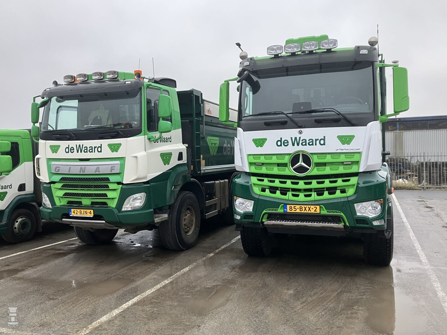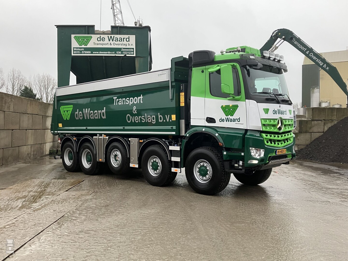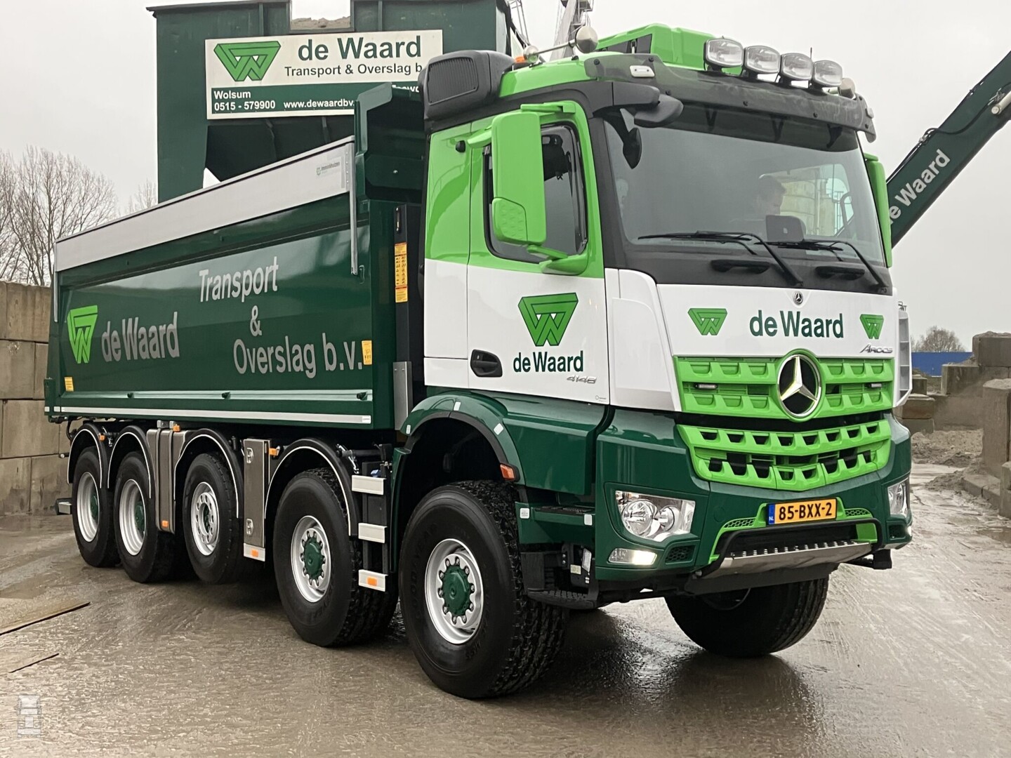 Voor optimale terreinvaardigheid werden de voorbanden vervangen door banden met de afmeting 445/65R22,5. Op de derde as is 385/65R22,5 gemonteerd terwijl de beide achterassen voorzien zijn van 24 inch wielen met banden van de afmeting 325/95R24. De truck is in de frisse huisstijl van De Waard gespoten en het resultaat is indrukwekkend, zeker naast de toch ook forse Ginaf. De tweede, identieke Arocs is momenteel in productie.