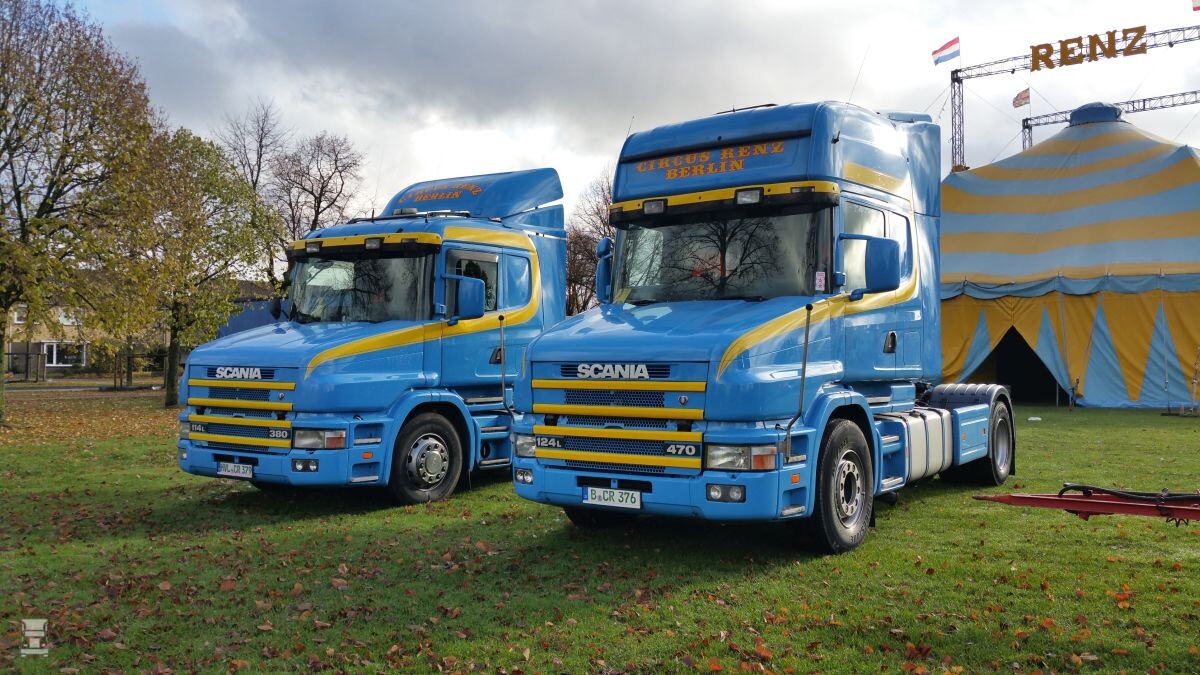 Tijdens een van de vele tripjes van afgelopen week zagen we het Berlijnse circus Renz dat in de Hollandse provincie was neergestreken. Meteen vielen de beide Scania 4-Serie neusjes op, keurig bij elkaar gezet. Het gaat om een 114L380 en een 124L470.