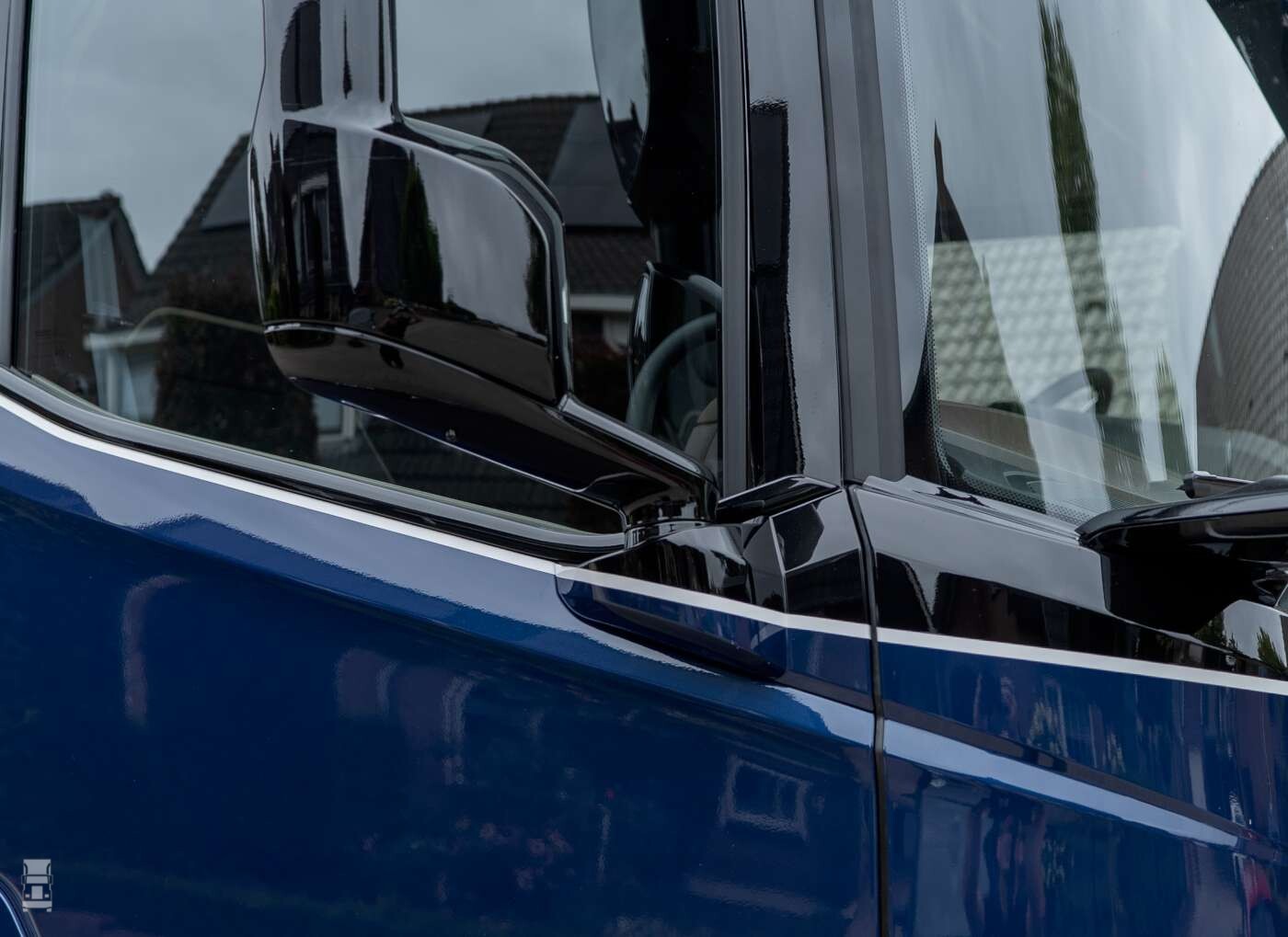 Zowel de lichtbalk achter op de cabine als de kisten met de geïntegreerde spatborden achter de voorwielen heeft Vlastuin erop gebouwd. Wat weer keurig aansluit op de spatborden van de cabine, ook over deze kisten en de Solar Guard lip een subtiel wit lijntje. Smoke breedtelampjes en dubbelbranders passen ook goed bij het metallic blauw. De Valk uit Barneveld heeft hem die prachtige kleur gegeven. Omdat Robert vooral veel staal zal gaan rijden van en naar de coater, zijn zwaailampen geen overbodige luxe. Maar met een XG+ ben je al snel te hoog, daarom is gekozen voor een zwaailichtbalk die vlak op het dak ligt. Niet te opvallend, maar toch doeltreffend. De FTG 6x2 is vol-luchtgeveerd met een elektrisch gestuurde voorloopas.