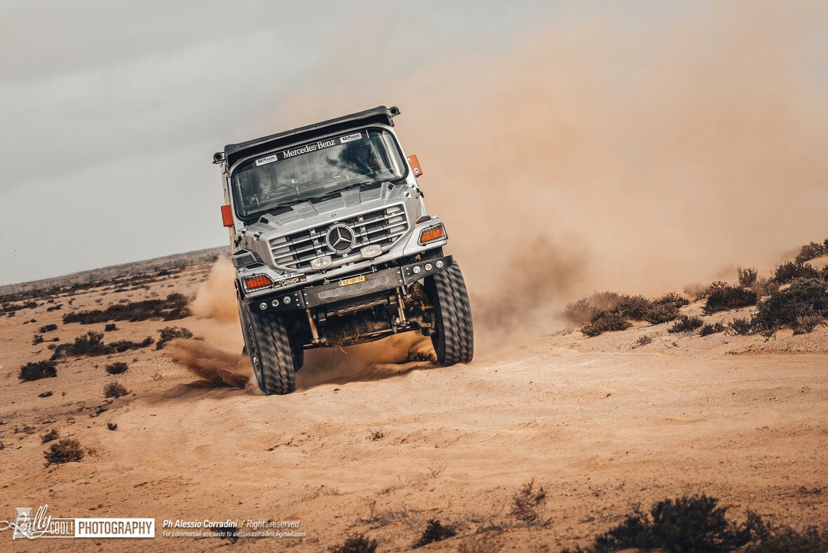 Johan Elfrink had in het eerste deel van de marathon-etappe nog problemen met het regelen van zijn bandenspanning, maar vandaag ging het lekker, kon er weer 150 kilometer per uur worden gereden en is de Zetros op een nette derde plek beland.