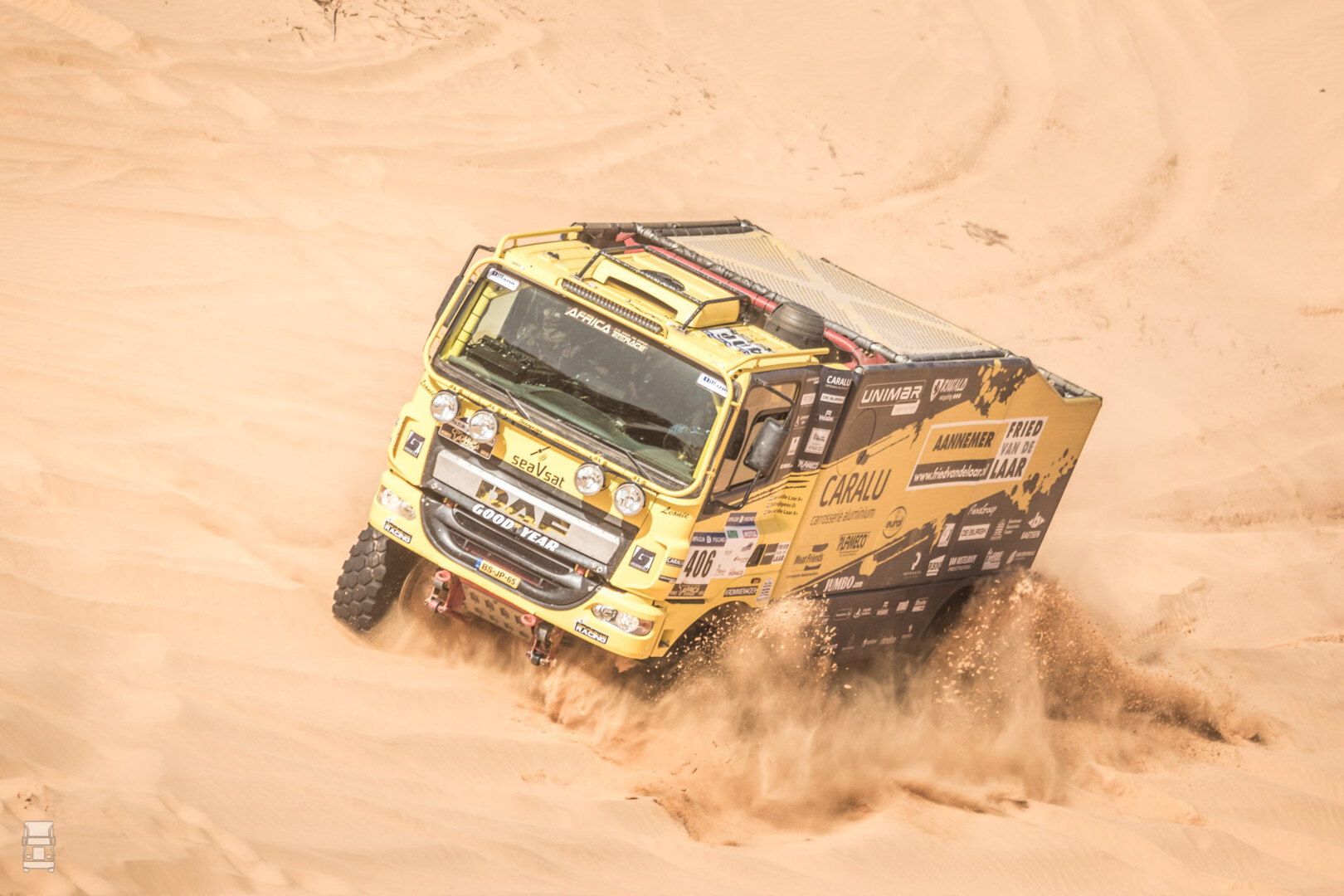 VanVelsen konde etappe niet rijden. “Hij stuurde niet goed terug en dat werd richting- en na de start erger. In de cabine waren wij het er over eens: dit moeten we niet doen. We hadden ons verheugd op een dag waar we waarschijnlijk best goed hadden kunnen doen als we zo de verhalen horen in het bivak. Veiligheid gaat voor alles” Over de weg onderweg naar het bivak zit de racecrew zowaar haar eigen servicetruck met de cabine omhoog staan. “En toen waren wij ineens de snelle assistentie!”vertelt Aad “laten wij nou precies die slang bij ons hebben. Gefixt en toen snel naar het bivak. Ondertussen is het probleem door onze geweldige monteurs opgelost en mogen we morgen weer starten”.