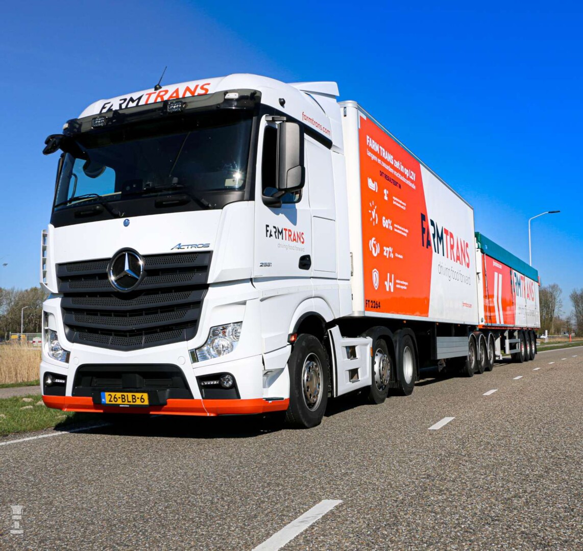 Farm Trans zet een B-Double LZV combinatie in tussen Friesland en Zuid- Nederland en België. Vanaf deze week rijdt de fraaie combinatie met pootgoed. Dankzij dit concept kunnen voortaan drie klanten in één rit gecombineerd worden. Doordat er gebruik gemaakt wordt van een B-Double combinatie kan de trekker het laatste deel van de route met één trailer afleggen naar de klant.