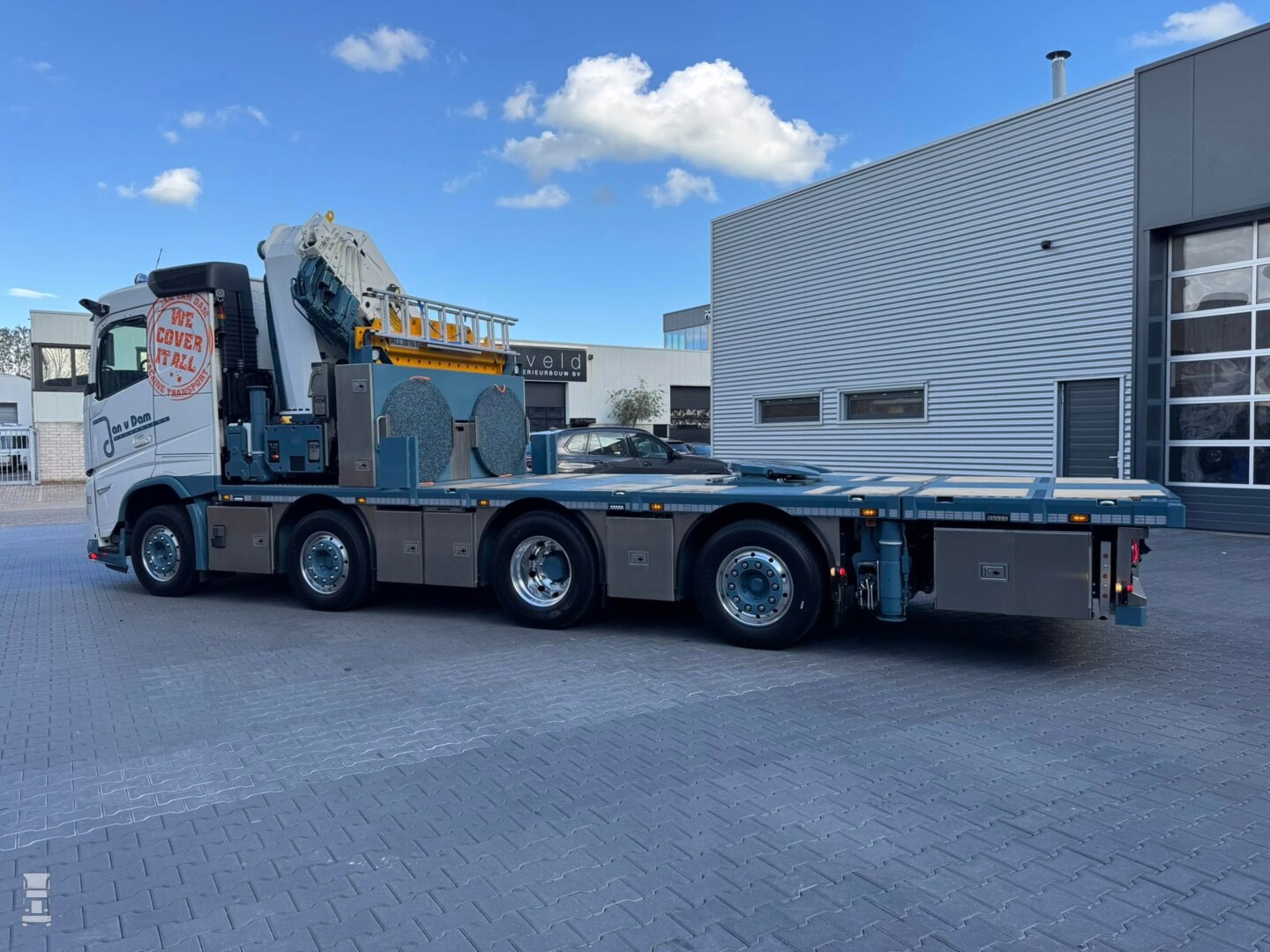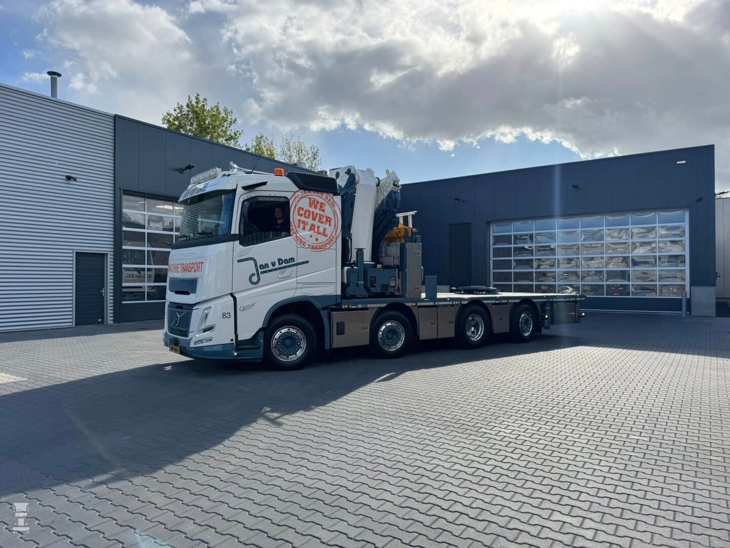 De truck is uitgerust met een HMF OK6 95 Ton/meter autolaadkraan met jib. Opvallend genoeg is de truck niet voorzien van front afstempeling. Dat kan namelijk niet met een Aero neus. Klanten die dat willen moeten de standaard, vlakke cabine bestellen bij Volvo,