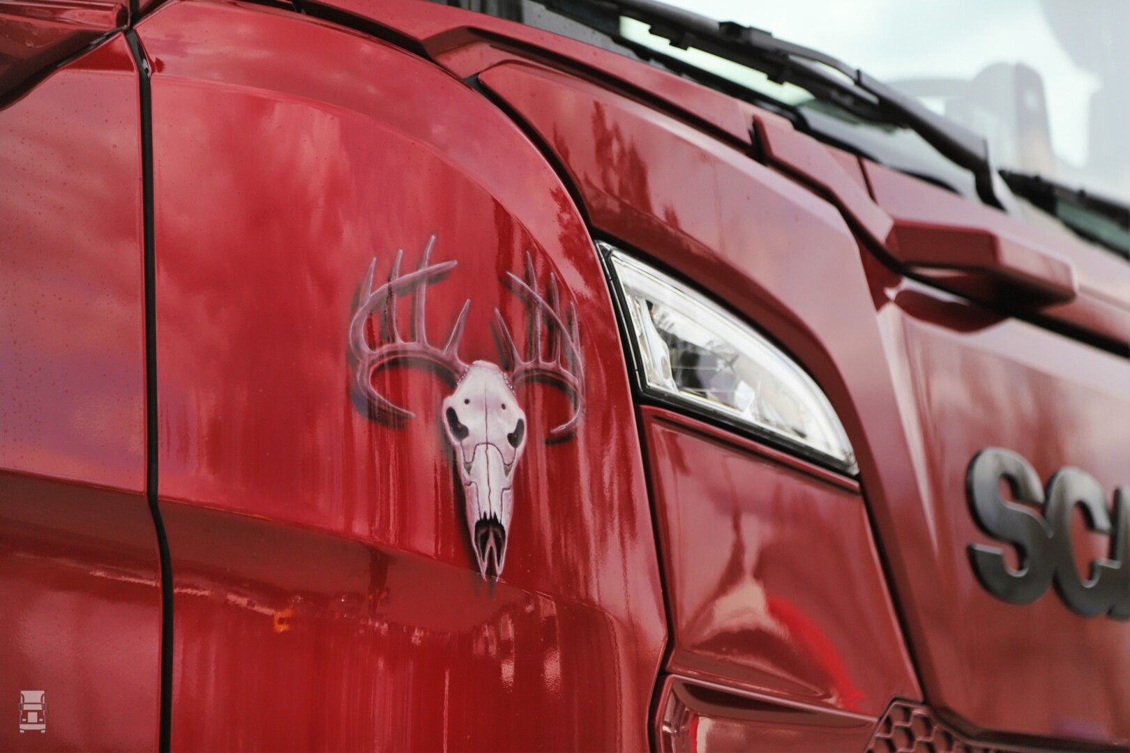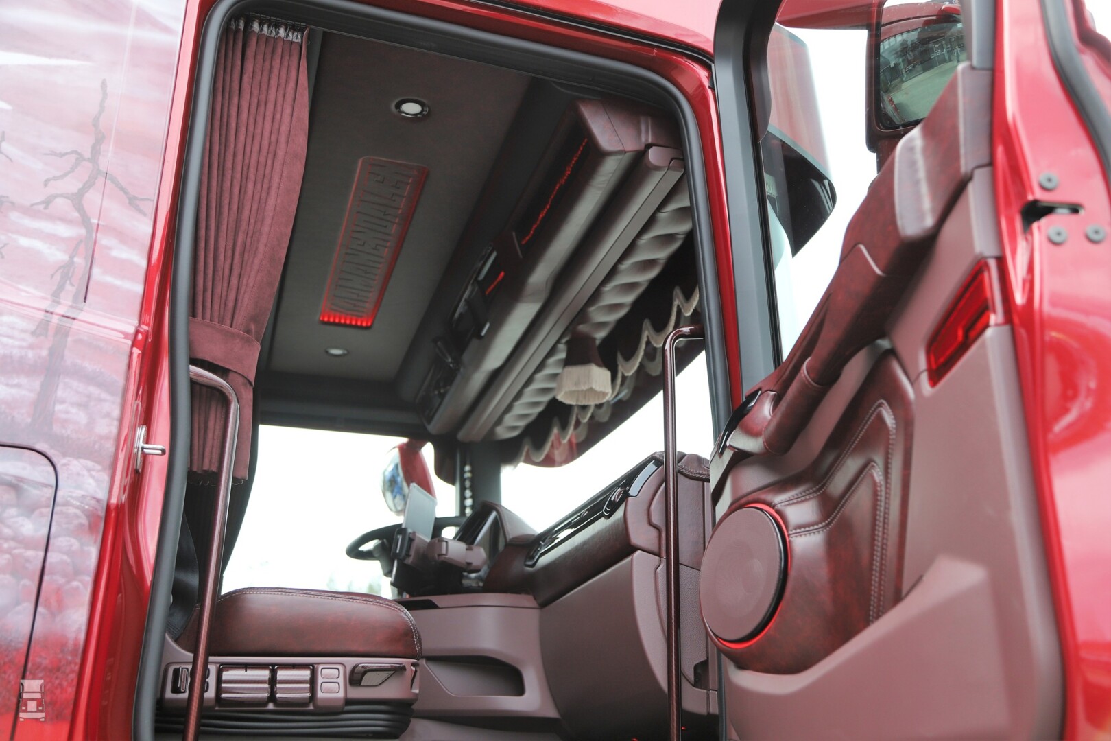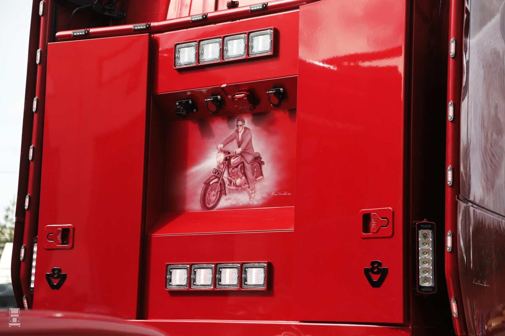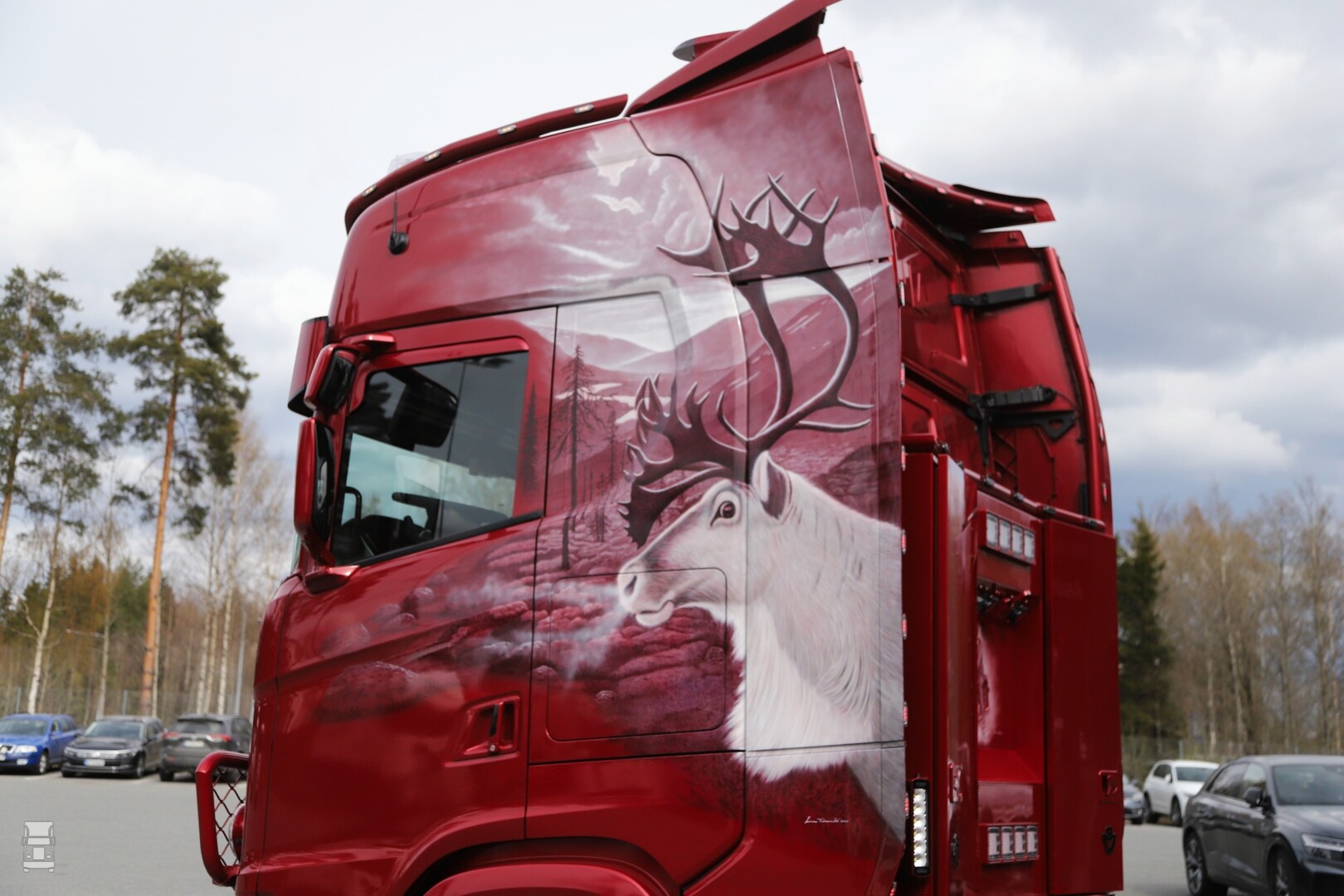 De Scania 770S werd in de huisstijl van het bedrijf gespoten met fraai special paint werk. Met een verlengde zonneklep, een stoere bullbar en op glanzende Alcoa's is het resultaat erg strak en fraai geworden. Achter de cabine is een fraaie kistenwand gebouwd, ook voorzien van special paint werk en verschillende lampen. Met afgedichte chassis en de speciale achterbumper met bloklampen maken het plaatje helemaal af.