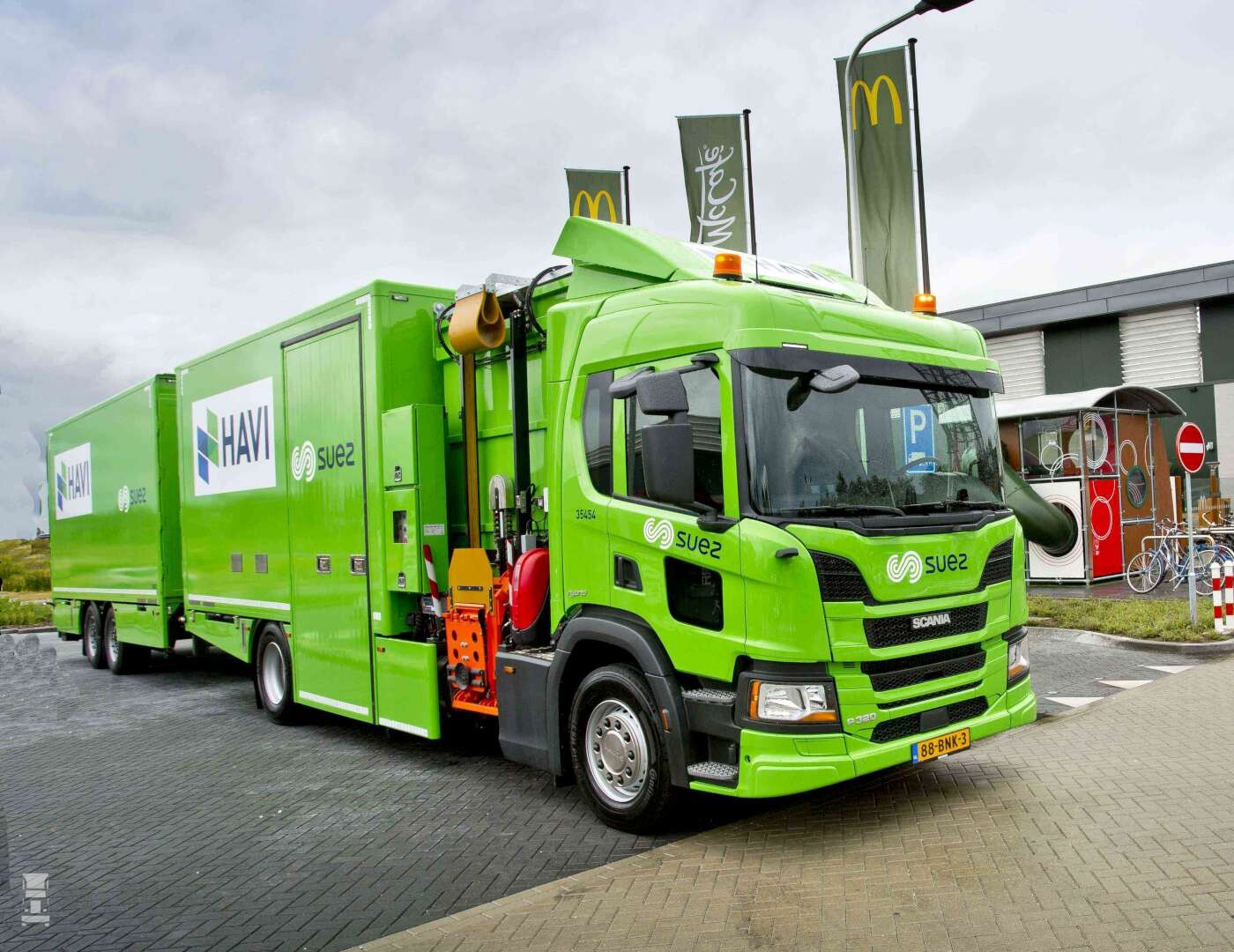 Suez en Havi maken gebruik van een Scania Hybride truck waarmee op lage snelheid volledig elektrisch gereden kan worden. Dat betekent dat de aan en afvoer van de Mac voortaan fluisterstil wordt gedaan. Opletten dus, want deze hoor je niet aankomen, maar het is wel mooi schoon met zero-emission.