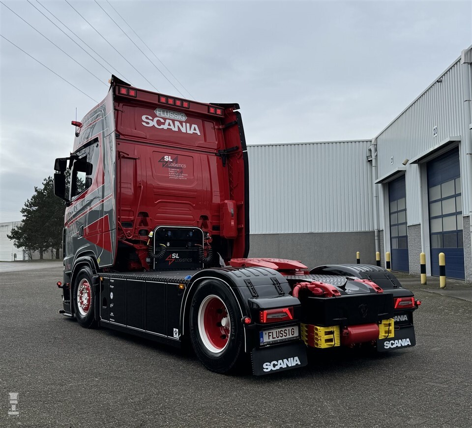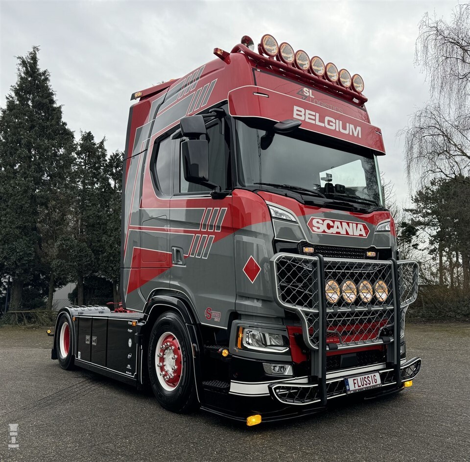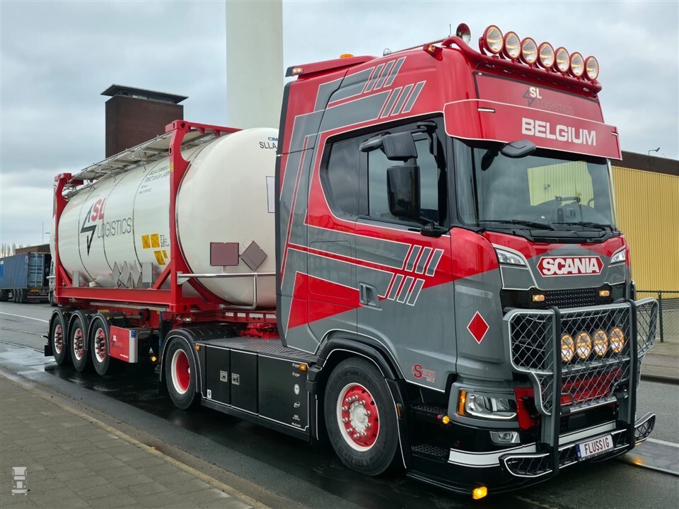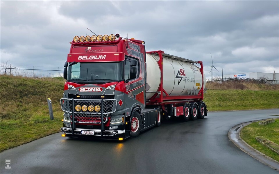 Zoals deze Scania S530 V8, die onlangs aan het wagenpark van SL Logistics is toegevoegd. Bovengenoemde elementen zijn hier ruimschoots aanwezig, waardoor deze Scania weer extra opvalt. Kijk maar eens naar die batterij van zeven verstralers op het dak. De Scania kreeg de bijnaam Flussig mee, wat een referentie is aan de tankcontainers waarmee hij onderweg gaat. Op z’n Belgisch is de naam natuurlijk te lezen in het kenteken van de Scania.
