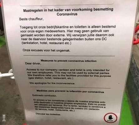 Terwijl de veiligheidsmaatregelen in Nederland en Europa in verband met het coronavirus dagelijks opgeschroefd worden, wordt het chauffeurs volgens vakbond FNV ‘onmogelijk’ gemaakt zich aan deze voorschriften te houden. FNV Transport en Logistiek kreeg de afgelopen dagen tientallen telefoontjes van boze en ongeruste vrachtwagenchauffeurs. FNV eist ook voor beroepschauffeurs hygiënische en veilige werkomstandigheden, aldus de bond.
