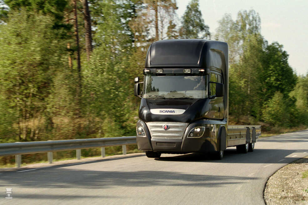 In 2013 heeft de Europese Commissie een zogenaamd amendement van richtlijn 96.53/EG goedgekeurd waarin geregeld is dat trucks langer mogen worden als dat de stroomlijn en de verkeersveiligheid verbetert. Naar schatting zou het een jaar of vijf duren voordat deze regel geïmplementeerd wordt en dat betekent dus dat we ergens in 2018 de eerste fopneusjes zien opduiken. Fopneusjes ja, want de vooras blijft op dezelfde plek staan. Alles wat daar voor komt wordt kreukelzone en dient verder ter verbetering van de stroomlijn. Scania experimenteerde jaren geleden al met zo'n model en het ziet er naar uit dat de hele discussie daar zo ongeveer begon. Hier zie je een foto van het Scania prototype van toen. Nu maar hopen dat we daar geen invloeden van terug zien in de nieuwe Scania die er aan staat te komen. Ik bedoel, smaken mogen verschillen maar dit vind ik nou niet heel erg mooi of zo..
