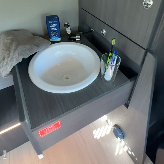 Aan de bijrijderskant is een rondzit, met daar onder kastjes en een koelkast. Slapen doe je in deze F-Max op het bovenbed. Het is een aardig initiatief, maar met slechts één stoel in de cabine lijkt het ons geen groot succes worden. Het idee van een eigen wasbakje is wel een heel goed initiatief, wat navolging verdient.