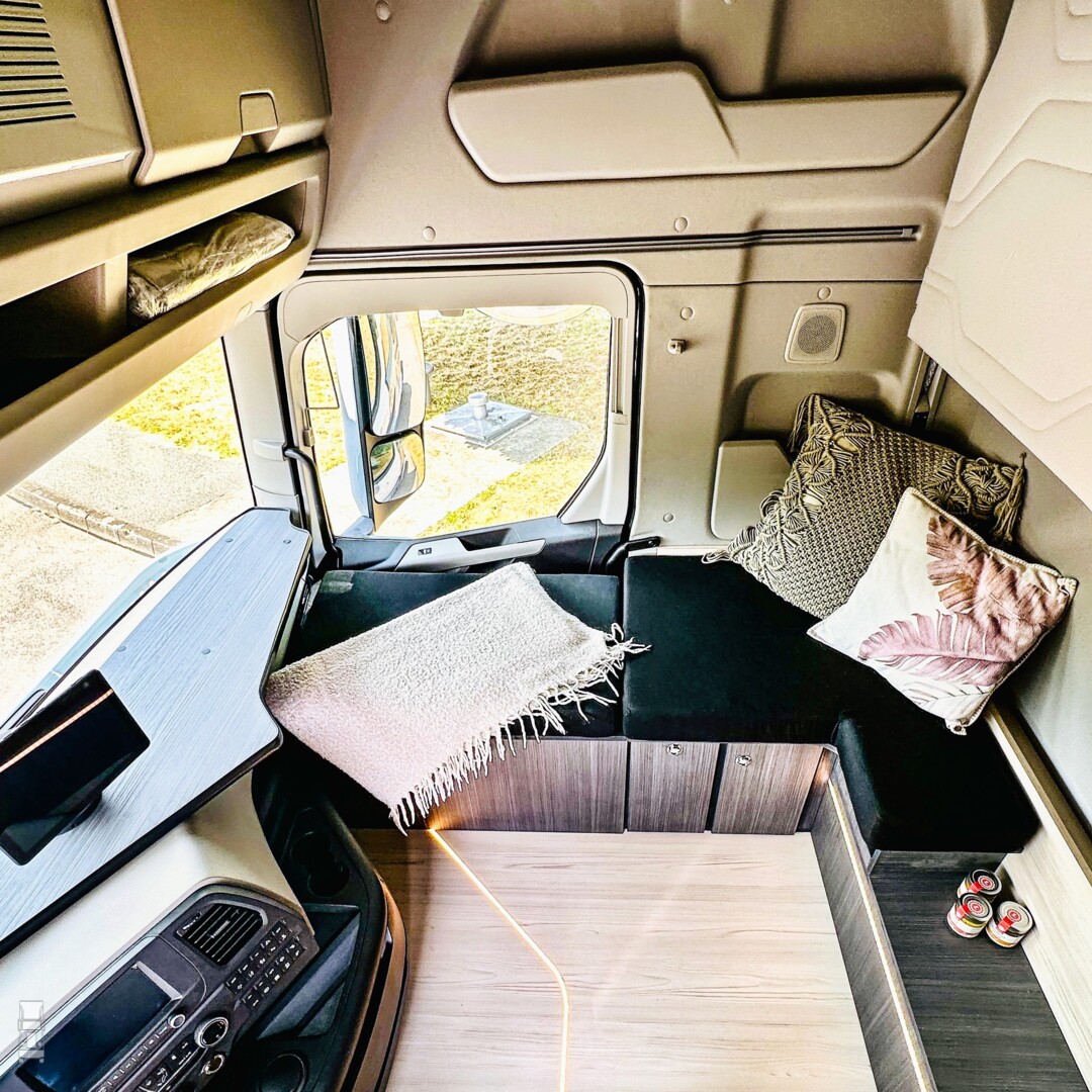 In de cabine is de bijrijdersstoel verwijderd om ruimte te maken voor meubeltjes en een vlakke parketvloer. Achter de bestuurdersstoel is een meubel gebouwd met daarin een uitschuifbare wasbak, een magnetron en een uitschuif tafeltje.