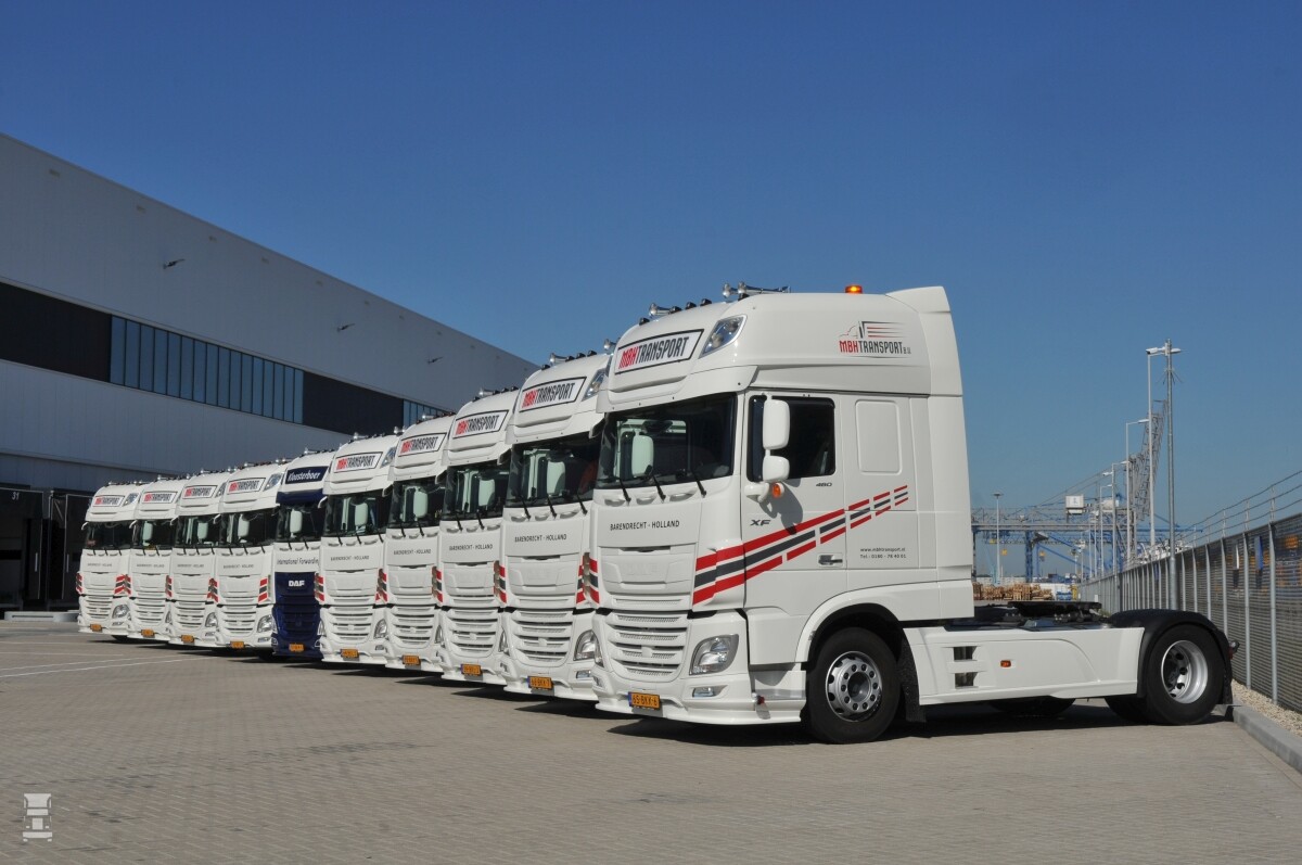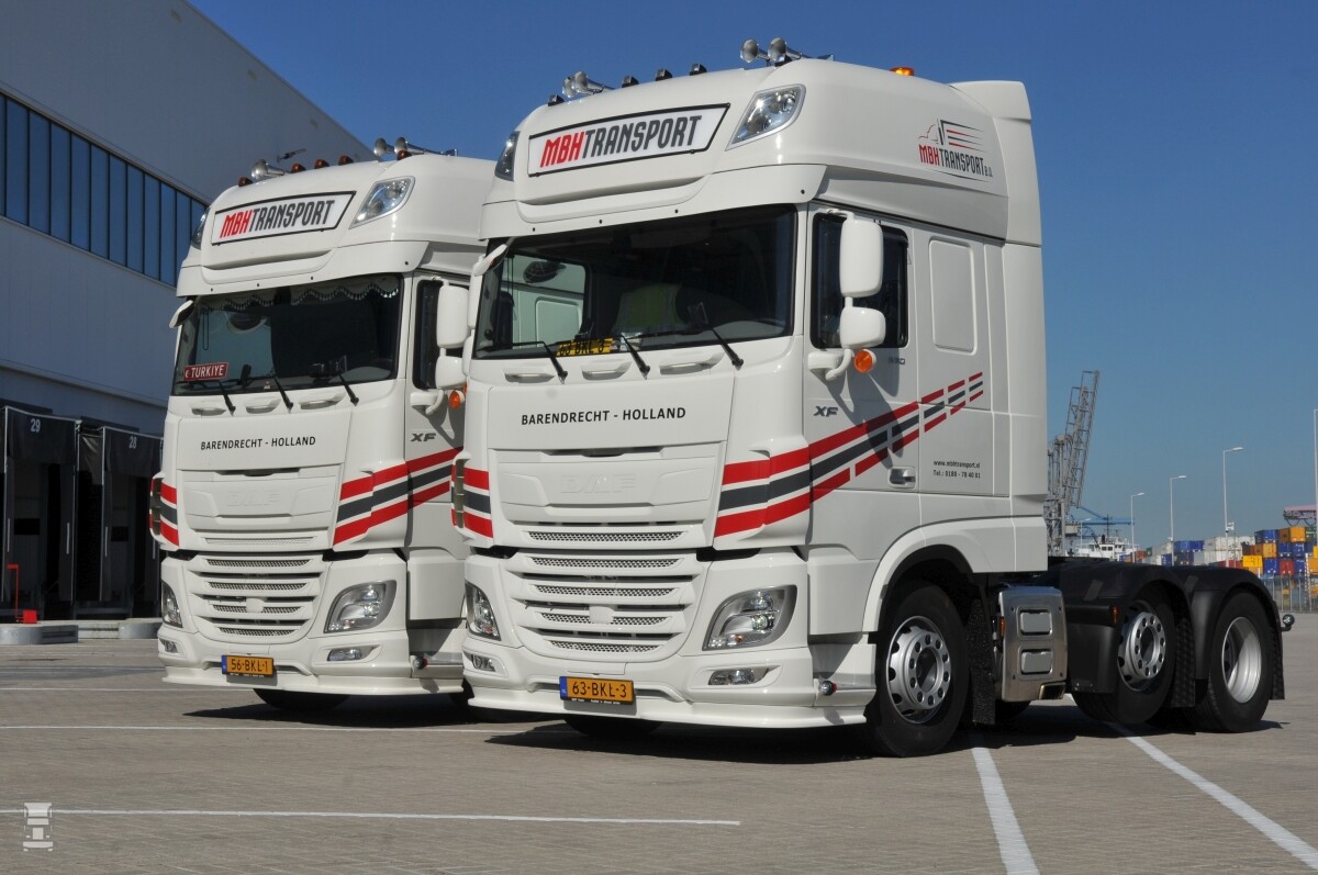 De nieuwe trucks zijn DAF's XF van het laatste type. Er werd in alle gevallen gekozen voor de Super Space Cab uitvoering en de vermogens verschillen van 480 tot 530 pk. "Gebleken is dat dit zuinige en betrouwbare trucks zijn waar we heel goed mee kunnen voor rijden bij onze klanten. De beloftes die DAF maakt ten aanzien van zuinigheid, betrouwbaarheid en chauffeurcomfort, worden nagekomen. Het onderhoud doen we in eigen beheer en we verwachten met name de sterkste versies in te gaan zetten voor LZV-werk. Daarmee kunnen we in het containerwerk klanten sneller en efficiƫnter bedienen." Naast de DAF's heeft MBH Transport ook nog MAN's, Volvo's en Mercedessen in de vloot.