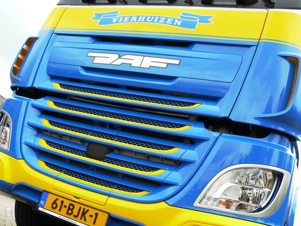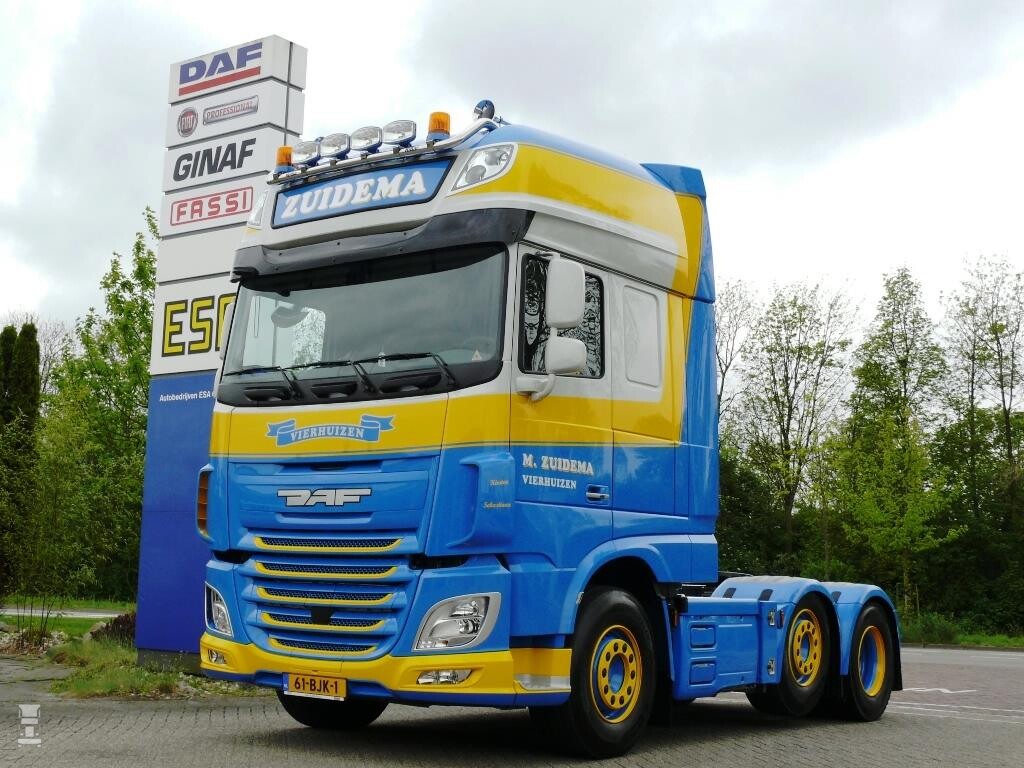 De trekker is van Zuidema Transport uit Vierhuizen in de provincie Groningen. Opvallend zijn de gekozen kleurstellingen en vooral de details die Marco Zuidema bedacht. Zo voert deze DAF een alternatief logo in de grille maar dat misstaat hem niet!