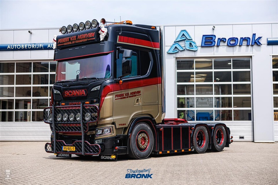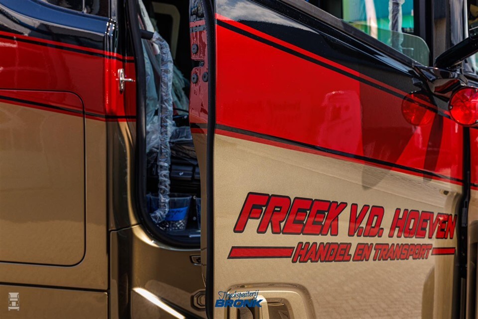 Indrukwekkend spuitwerk zien we wel vaker op vrachtwagens, zeker als het werk door Truckspuiterij Bronk is gedaan. De Scania V8 van Freek v.d. Hoeven Handel en Transport is geen uitzondering. De trekker blinkt uit in details, zowel in het spuitwerk als in slim weggewerkte accessoires. Bekijk de foto’s maar eens goed, dan zie je wat we bedoelen.