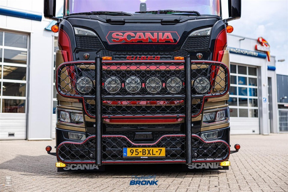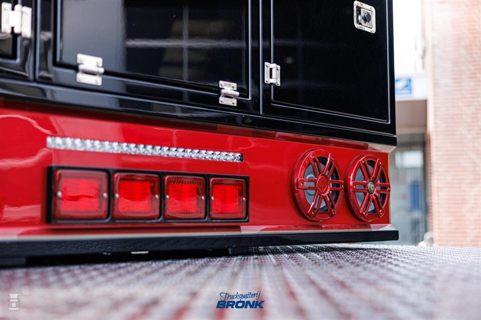 Zo zijn er op verschillende plaatsen LED-bars op slimme wijze weggewerkt, zoals boven de achterlichten en achter op de cabine. Ook verschillende speakers kregen een plaats, uiteraard netjes in kleur gespoten. Het leukste detail zit echter verstopt in de mooi weggewerkte kisten achter de cabine. De ketels zijn omgevormd tot flessen drank, compleet met prijslijst. Het geeft weer hoe goed er nagedacht is over de opbouw van deze Scania 770S V8 van Freek van den Hoeven. Niet voor niks duurde het hele project twee jaar!