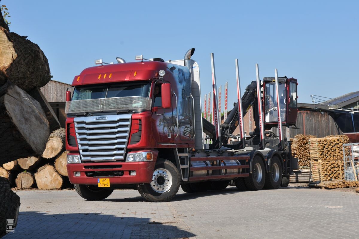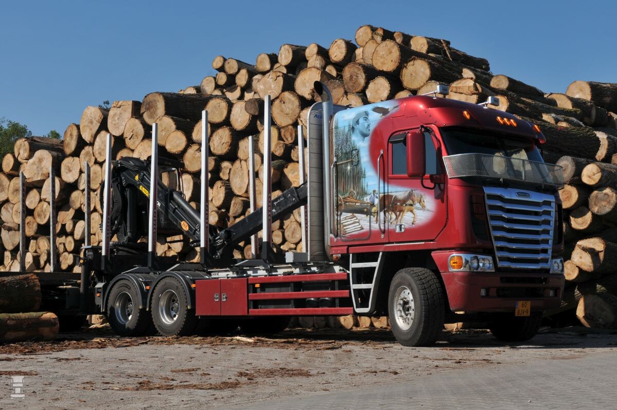 Maar Jaap Lamme uit Nederhorst den Berg wilde iets speciaals, dus haalde hij deze puntgave, fraai gespoten Argosy naar Nederland. Daar werd de truck omgebouwd om aan Europese wetgeving te kunnen voldoen. Denk aan inbouw van een tachograaf en ombouw naar een elektrisch systeem van 24 Volt. Bij Voortman Autoschade uit Ter Aar werd de cabine gespoten. De Freightliner heeft een duidelijk hoorbare Cummins motor en de rongenopbouw komt van Alucar uit Finland. Het chassis heeft luchtvering op het dubbel aangedreven tandemstel en achterop de motorwagen staat een Palfinger kraan om de vaak dikke boomstammen te kunnen laden en lossen. Voor Lamme is dit niet de eerste Amerikaan. Hij reed ook geruime tijd met een Mack Superliner die eveneens duidelijk te horen was.