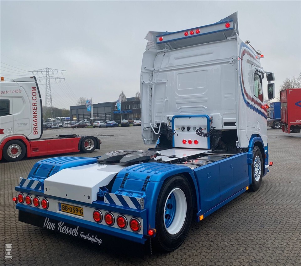 De bedrijfskleuren werden aangebracht door I.V.S. in Waalwijk. Dankzij het simpele ontwerp en de frisse kleuren ontstond direct een opvallende truck. Details als de in kleur gespoten wielen maken de Scania af. Van Kessel Truckstyling voorzag de Scania van een lichtbak, aangepaste zonneklep en extra verlichting. De Scania is voorzien van een lederpakket in het interieur, extra subwoofers en luchtvering rondom.