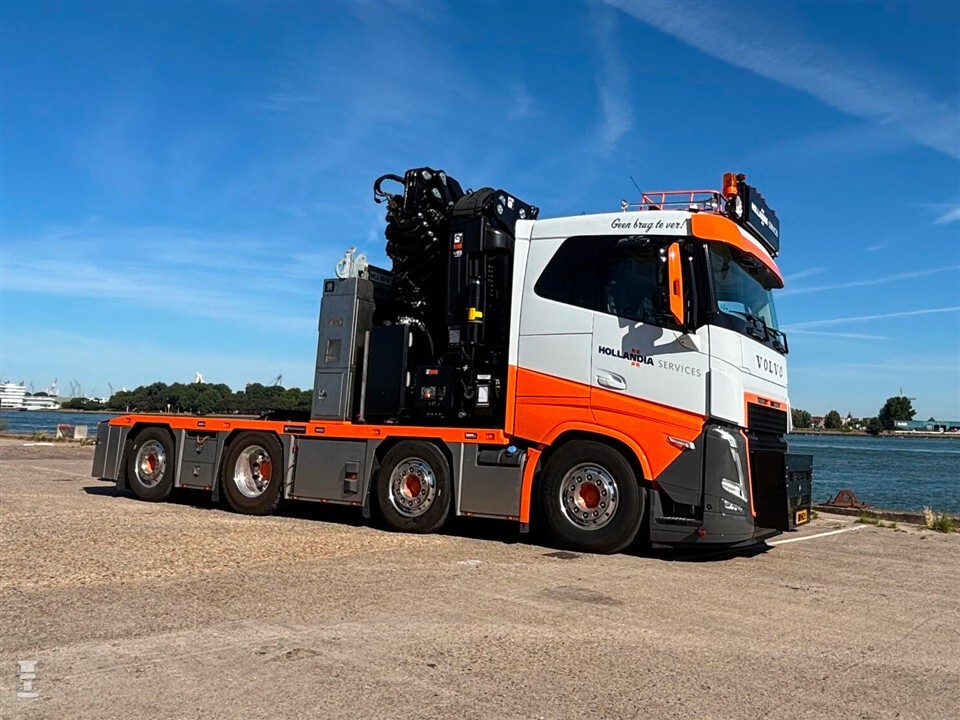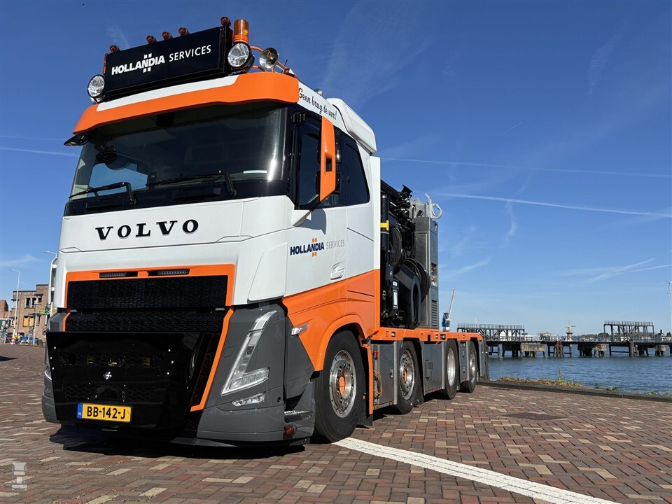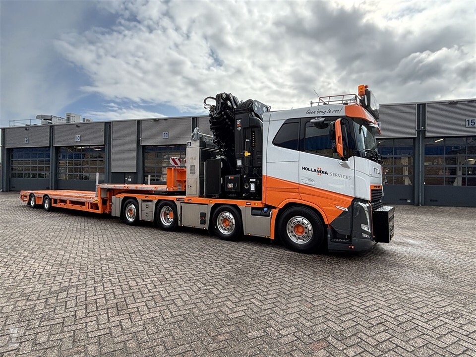 ‘Geen brug te ver’ staat er dan ook toepasselijk te lezen op de lage cabine van de Volvo FH 540. Geen Aero dit keer, wat waarschijnlijk te maken heeft met het gewicht aan de voorbumper. De Volvo 8x2 trekker is gekoppeld aan een eveneens nieuwe, korte Broshuis semi-dieplader. Samen maken ze een mooi stel. Een echte krachtpatser, zeker als je de flinke kraan achter de cabine bekijkt.