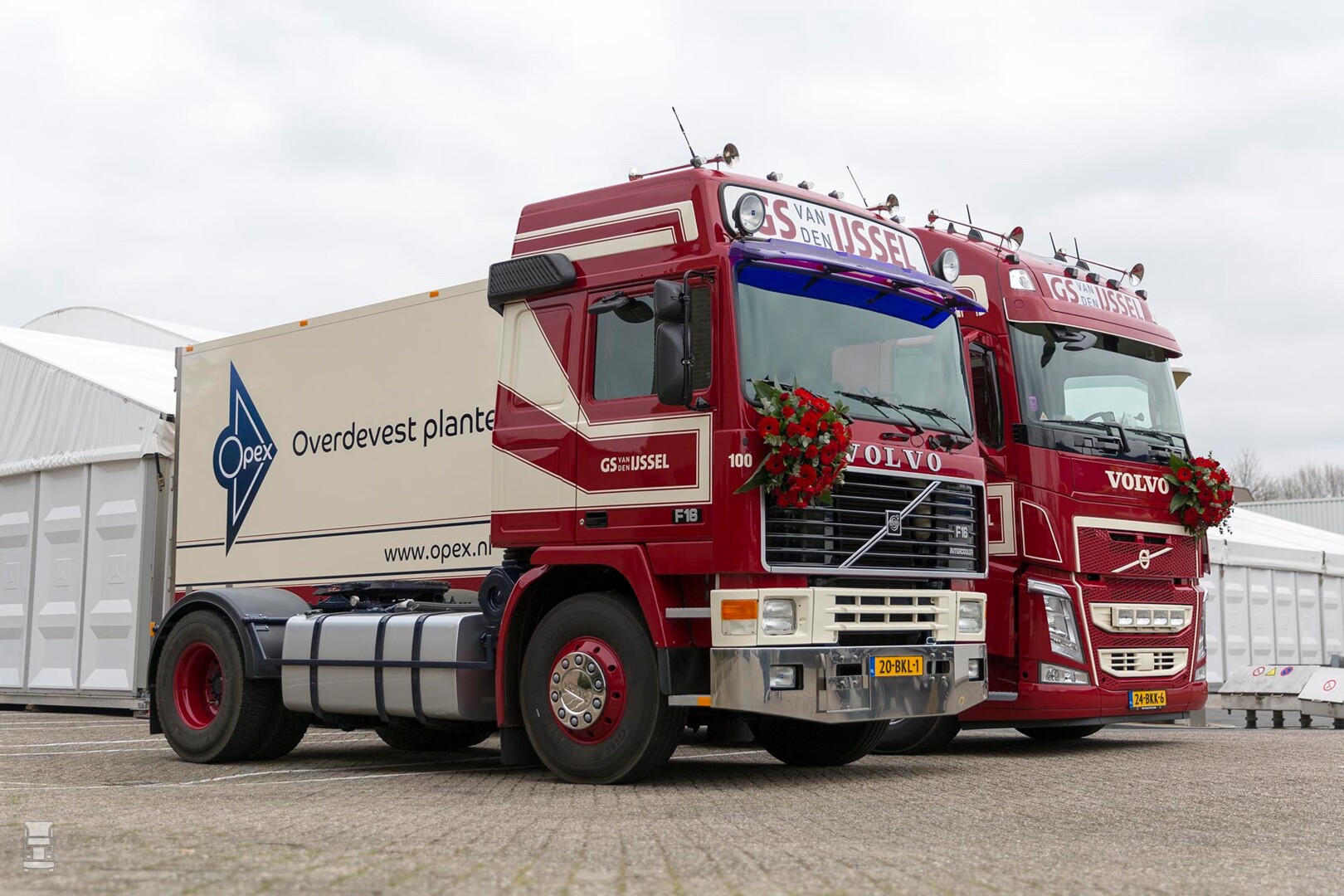 De oudste Volvo die bij G.S van den IJssel reed, is een Volvo F89 uit bouwjaar 1976. Deze trekker is sinds kort te bewonderen in het Nederlands Transport Museum in Nieuw-Vennep en ontbrak om die reden bij het jubileumfeest. Wel stonden er een onlangs volledig gerestaureerde Volvo F16-trekker uit 1990 en de nieuwste Volvo FH 6x2 bakwagen naast elkaar te glimmen. De laatste is met een wipkar als combinatie in gebruik voor geconditioneerd plantentransport naar Italië. “Dat heeft niets met olie te maken, maar ik kon het werk overnemen van een collega-transporteur”, aldus Robin van den IJssel. Die nuchtere mentaliteit kenmerkt de ondernemerszin waarmee hij, en de drie generaties voor hem, al een eeuw lang succesvol inspelen op kansen in de markt.