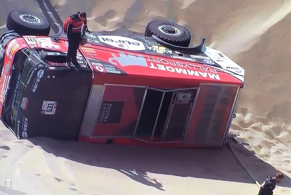 Nadat we in de vierde etappe al noodgedwongen afscheid hadden genomen van Martin van den Brink ging in etappe vijf Janus van Kasteren op zijn kant. Van Kasteren neemt devolledige verantwoordelijkheid daarvoor: ,,We reden met te weinig snelheid de duin op. Als je te zacht gaat heb je kans om te kiepen. Dat gebeurde. De truck viel om. Het was duidelijk een foutje van de rijder. Heel jammer, maar het hoort er blijkbaar bij.’’ Gelukkig kon de truck, met hulp van onder andere het brandweermannenteam, weer op haar pootjes gezet worden, maar het kost wel weer veel tijd.