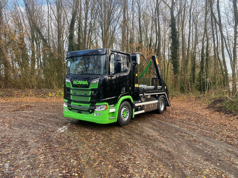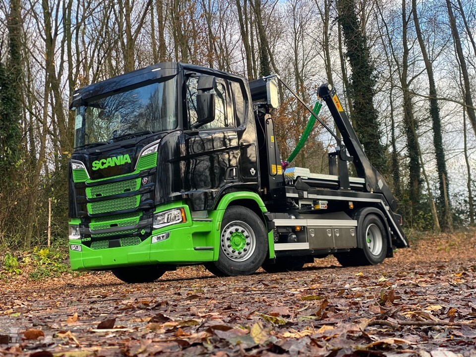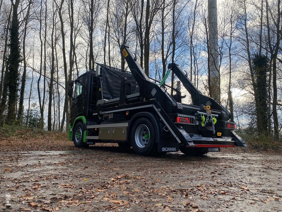 De Scania V8 is uitgevoerd als 4x2 met een dagcabine. Het 14-tons haakarmsysteem van Hyvalift is opgebouwd door Grobo Hydrauliek uit Sumar. Deze werkt door middel van een afstandbediening. De Scania is bovendien voorzien van een automatisch afnetsysteem, met een nettenrek achter de cabine. Tot slot zijn dubbele opbergkisten gemonteerd.