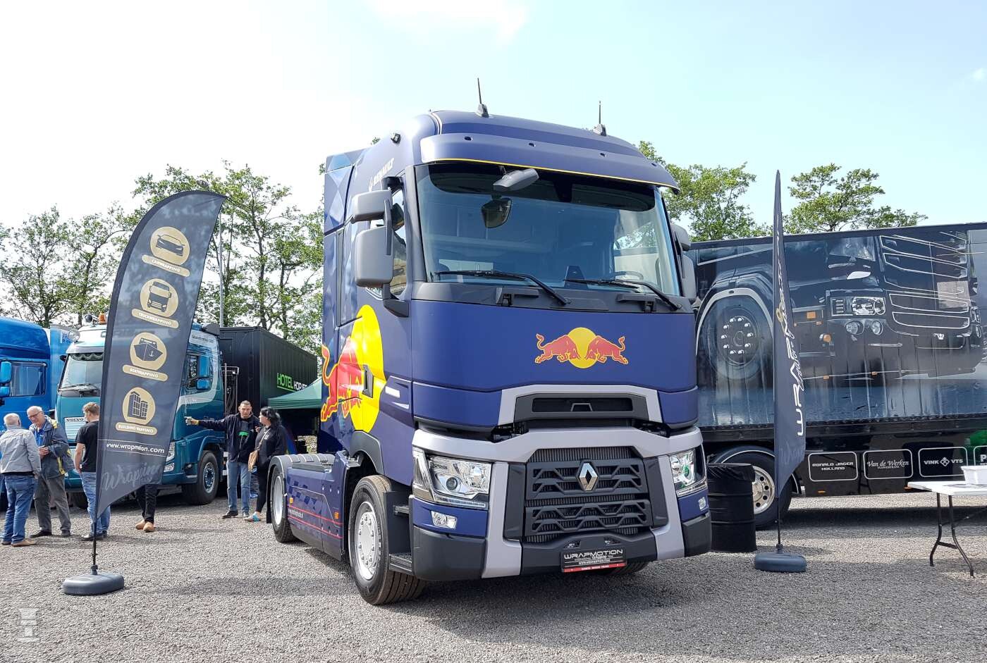 Het weer was overwegend prachtig en de trucks stonden dan ook mooi te glimmen onder een fraai zonnetje. Eén van de verrassingen van het evenement was een Renault High-T die door Wrapmotion in de RedBull kleuren is uitgevoerd. De trekker is helemaal mat, net als de officiële trucks van het team van Max Verstappen. een superleuk idee want dat is hoogst actueel door de successen van Max!