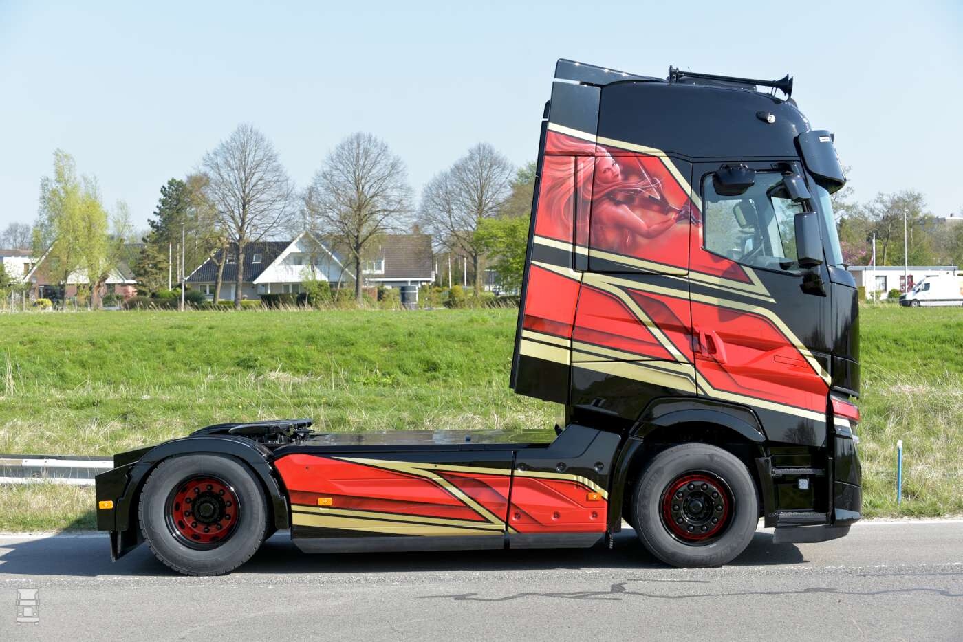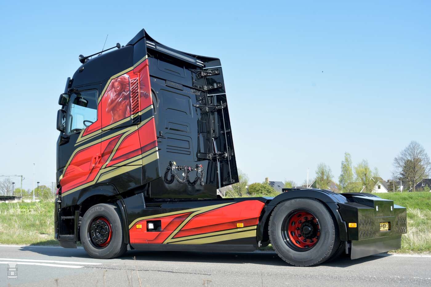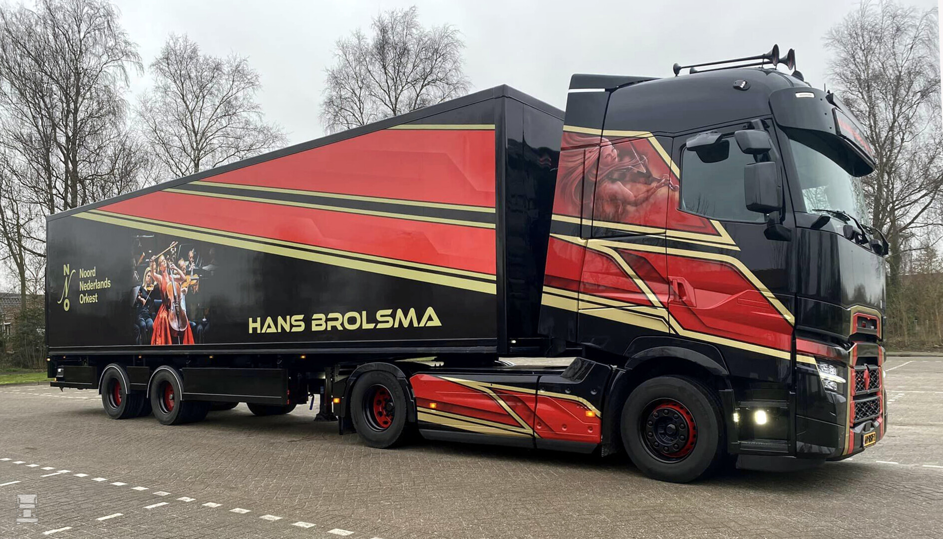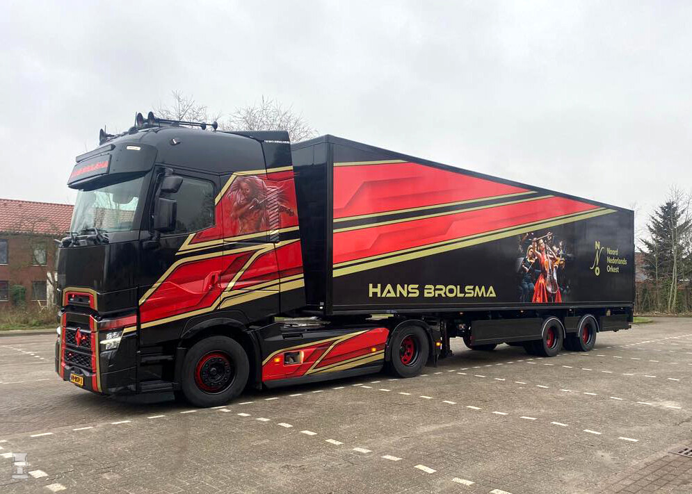 Het special paint werk op de trekker is van MW Designs, maar om de hele trailer te airbrushen ging wat te ver, vandaag dat er gekozen is voor een full color wrap. Het ontwerp is van Hans, in overleg met het Noord Nederlands Orkest waar hij voor rijdt. De wrap werd door Visser Reclame in Assen geprint en opgeplakt. De gebruikte compacte oplegger werd gebouwd door Renders trailers.
