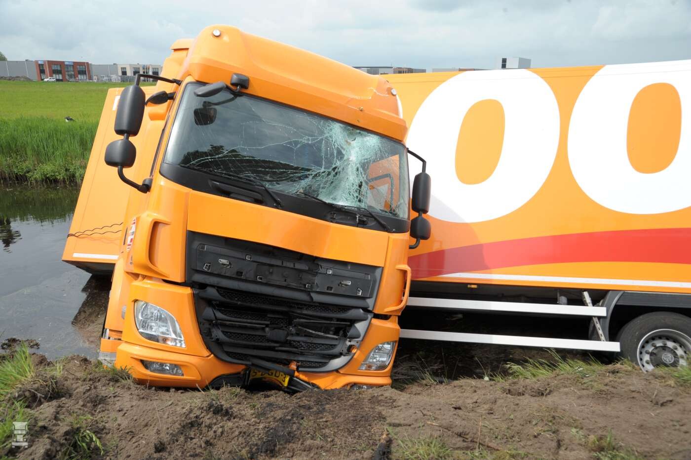 De ongedeerde chauffeur ging niet in op vragen over de toedracht maar wist ons wel te melden dat de oplegger op wat emballage na leeg is. De schade lijkt gezien de omstandigheden mee te vallen. Toch zal het nog een behoorlijke bergingsklus worden om het hele span zonder meer schade aan te brengen uit de sloot te takelen.