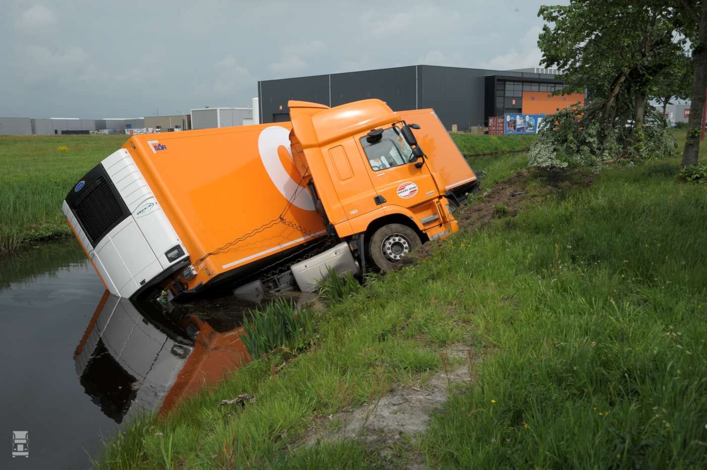 In Heerenveen is een combinatie van de Bakker Groep in de Coop kleuren in de sloot terecht gekomen. De chauffeur heeft om onduidelijke redenen een bocht gemist en is rechtdoor gereden, via een boom de brede sloot langs de Saturnus in.