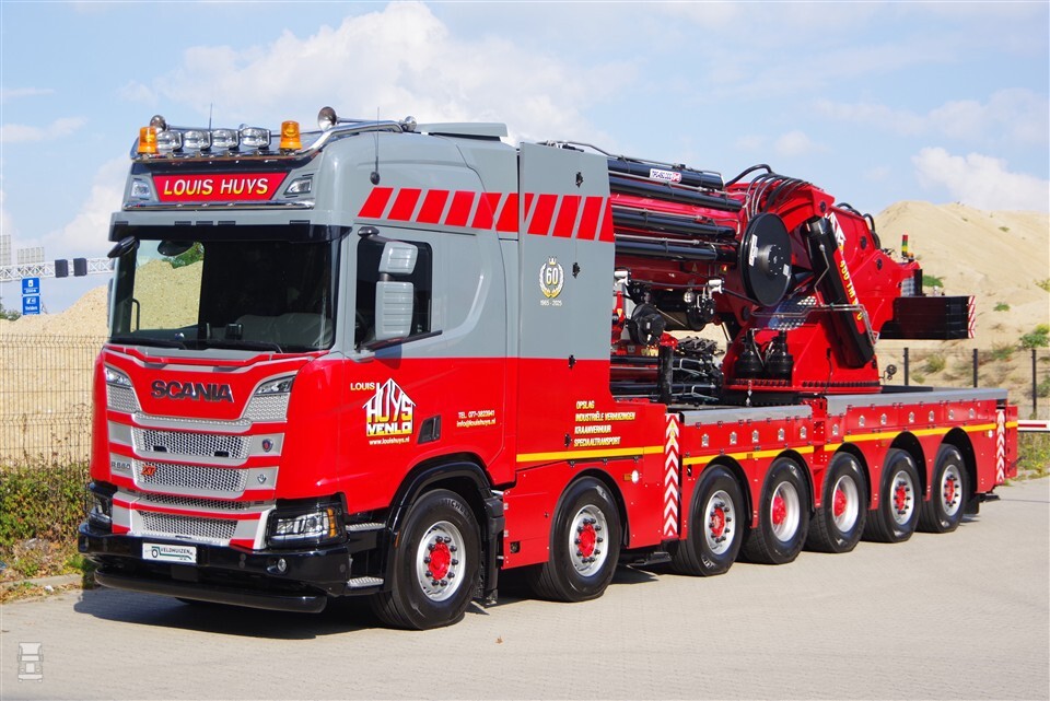 De bijzondere Scania kraanwagen was het stralende middelpunt van het 60-jarig jubileum van Louis Huys. Niet vreemd, want een zevenassige kraanwagen is echt iets bijzonders. De Scania draagt een MPG kraan van maar liefst 450 ton/meter. Tot nu toe was de zwaarste autolaadkraan een 365 ton/meter-kraan. “Dat was toen de zwaarste autolaadkraan in Nederland maar inmiddels zijn de ontwikkelingen verder en vroeg het werk om een nog zwaardere kraan”, aldus eigenaar Peter Huys.