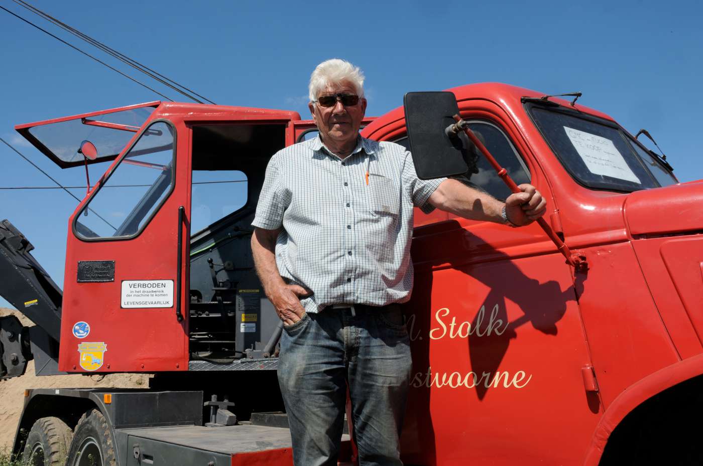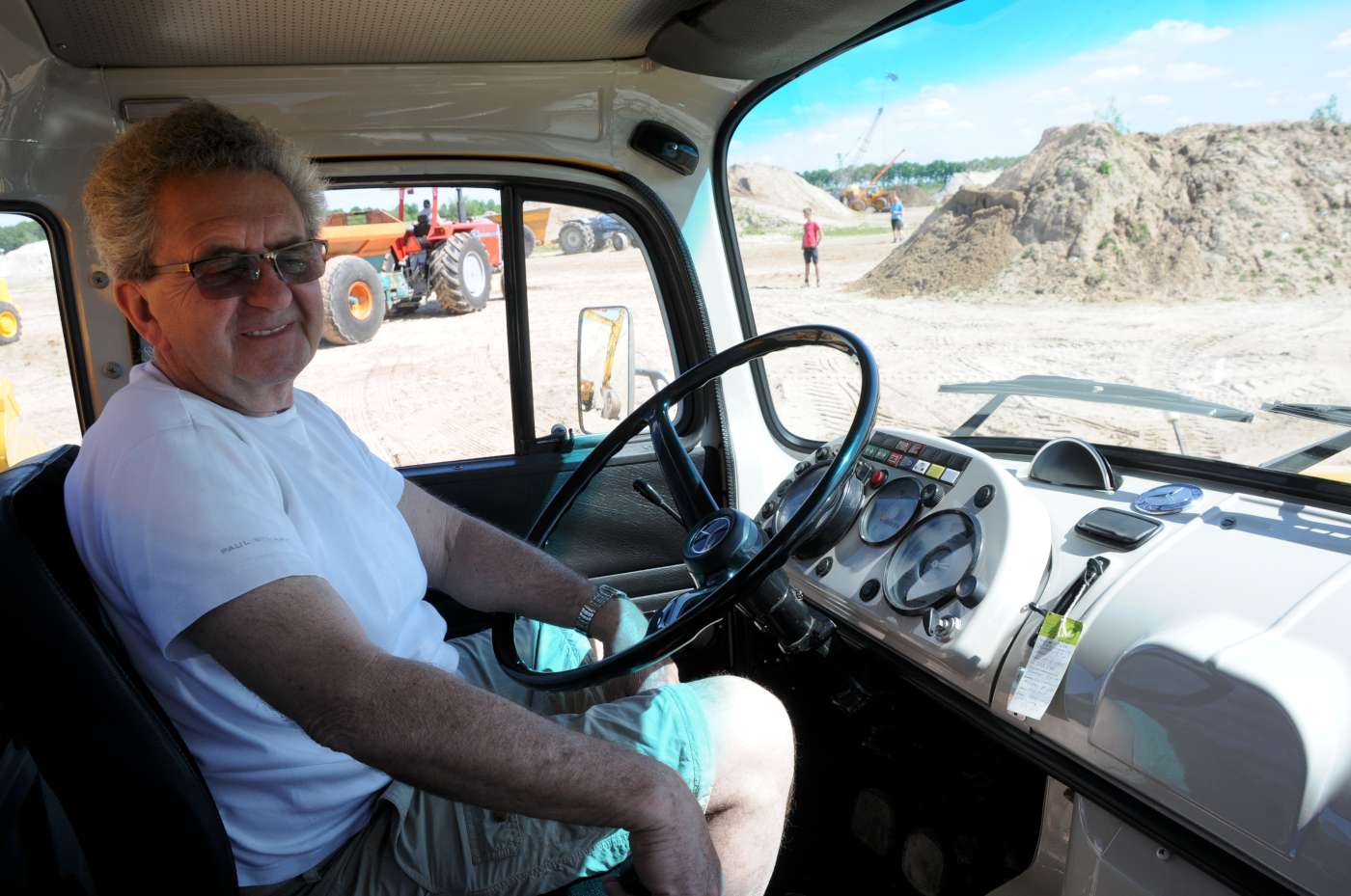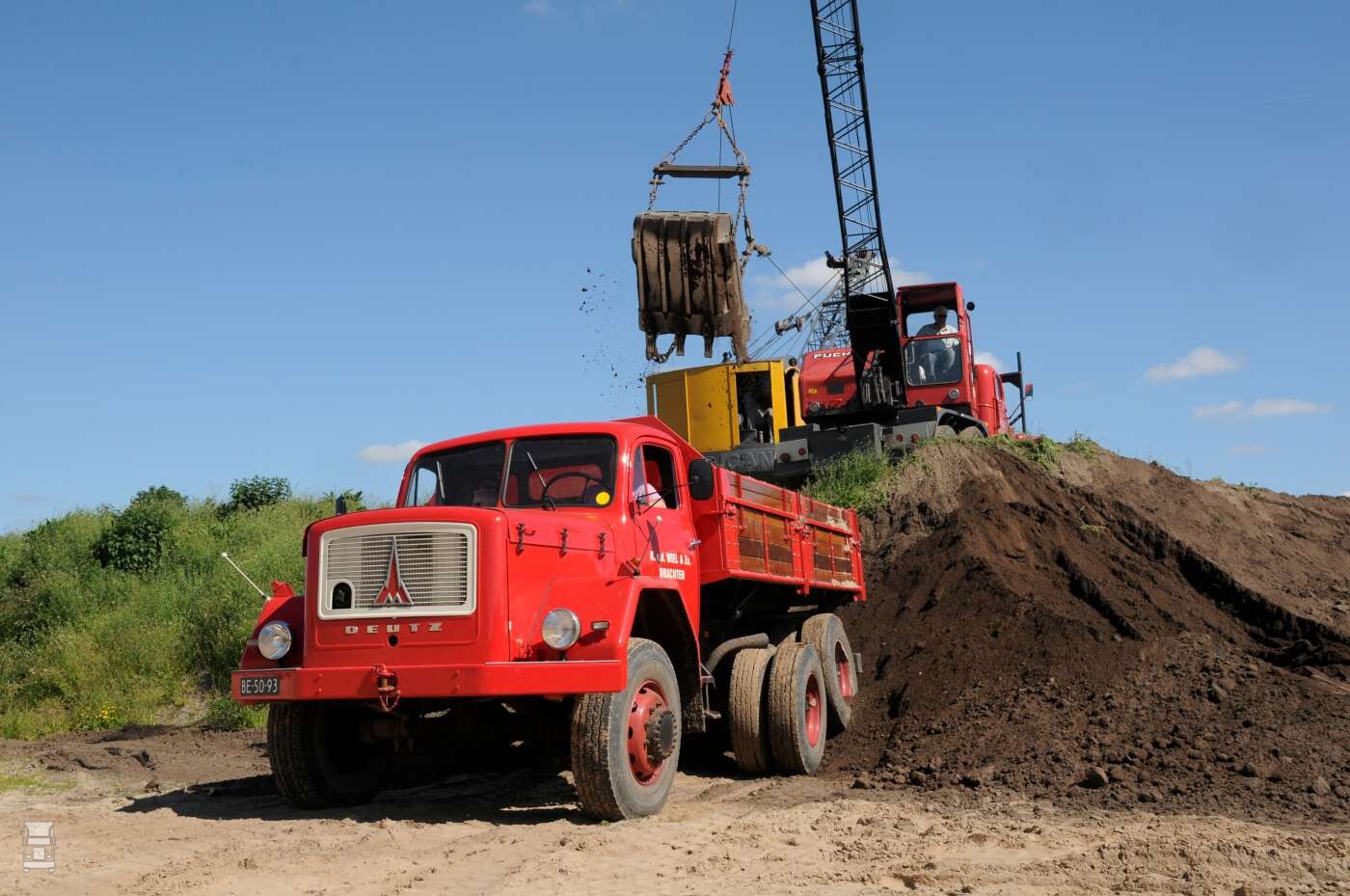 In de zandput van Van der Wiel ronkt het van de activiteiten. De, veelal wat oudere heren zijn driftig in de weer met hun zorgvuldig gerestaureerde machines, trucks en landbouwtrekkers. Jan Bingemans bijvoorbeeld. Deze 79 jaar oude Zeeuw is bezig met een Fuchs draadkraan die op een 1944 GMC truck gemonteerd is. Geroutineerd trekt hij de bak vol om zo de trucks te laden. ,,Ik heb dit mijn hele leven gedaan en dan verleer je het niet'' aldus Jan. De truck met de kraan is overigens van M. Stolk uit Oostvoorne. En voor de liefhebbers, de unieke combinatie van de Fuchs dragline op de oude GMC staat te koop!
