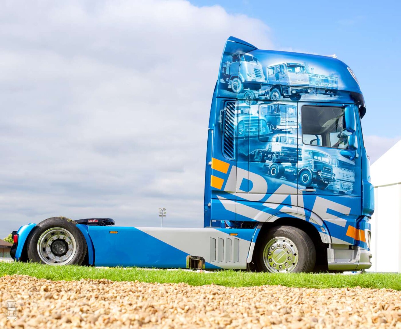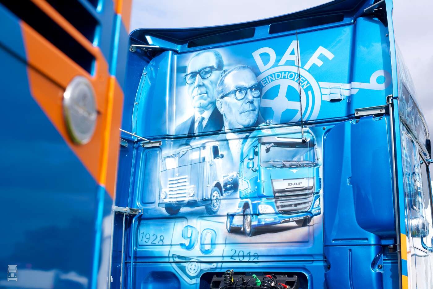 In Engeland is het negentig jarige jubileum van DAF vorig jaar ook stevig gevierd. De Britse organisatie besloot een DAF Super Space Cab helemaal in airbrush te laten uitvoeren. Op de zijkanten staan in de typische stijl van Adam Haden alle DAF modellen én de oprichters van het bedrijf, Hub en Wim van Doorne.