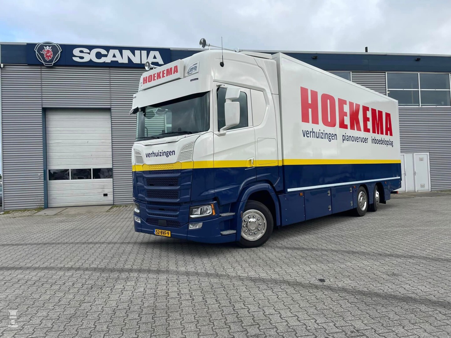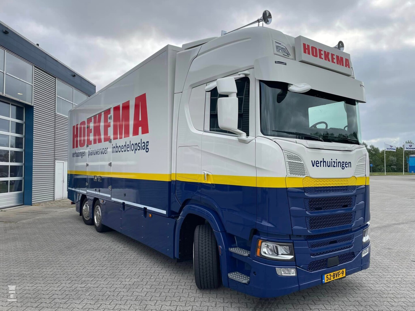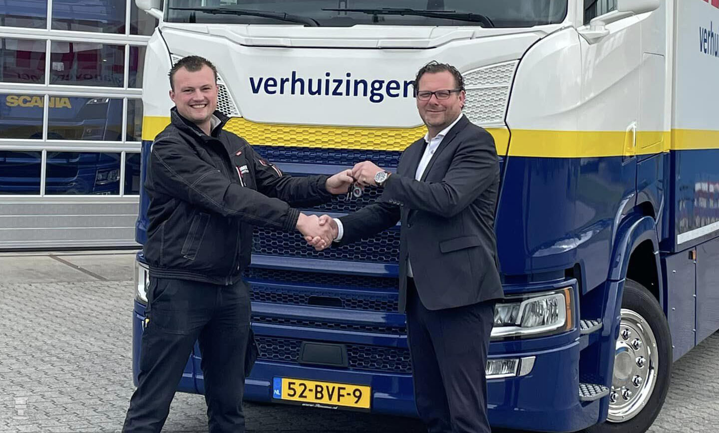 Hoekema Verhuizingen heeft vier trucks maar de nieuwste moest een speciale worden. De nieuwe Scania werd voorzien van een extra lange zonneklep en een Van Eck opbouw die werd overgezet van een vorig chassis. De kwaliteit van deze Nederlandse opbouw was dermate goed dat hij nog prima een ronde mee kon. Het geheel werd in de opvallende en strakke kleuren van Hoekema gespoten. Op de foto zie je Jelle Hoekema met Scania verkoopadviseur Bonne Hielkema van Scania dealer Rinsma.