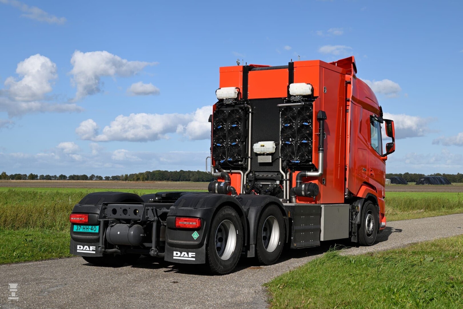MaserFrakt AB rijdt al met een voorganger van deze nieuwe truck die als tijdelijke truck werd ingezet. De nieuwe truck, gebaseerd op een DAF XF 6x2 heeft echter een veel groter bereik. De truck heeft tanks achter de cabine waarin 100 kg waterstof past. Door middel van de brandstofcel wordt daar stroom van gemaakt, waarmee de truck wordt aangedreven. De truck is goed voor totaalgewichten tot 64 ton en heeft een actieradius van maar liefst 1080 kilometer. Daarna hoeft hij niet aan de stekker, maar kun je hem in 20 minuten weer voltanken met waterstof. Tenminste, als je een waterstof tankstation op je route hebt. Daar hebben Holthausen en de klant echter vast al over nagedacht.